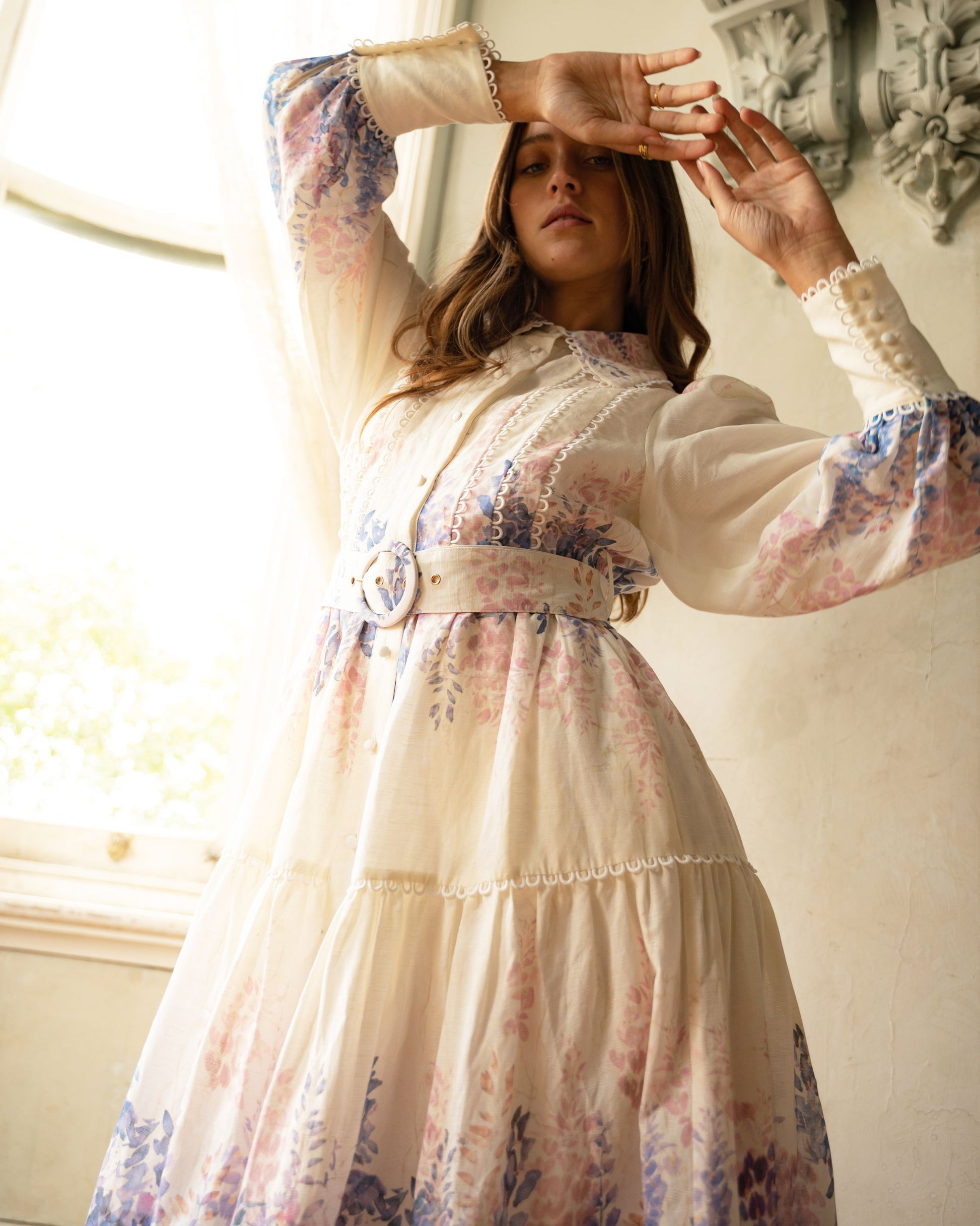 Fresh from the archive is the Aurélie maxi dress, a stunningly romantic button through dress crafted from our signature linen/ silk blend and featuring the most beautiful wisteria placement print. Designed for any summer day occasion, the Aurélie is destined to be worn on repeat season after season.