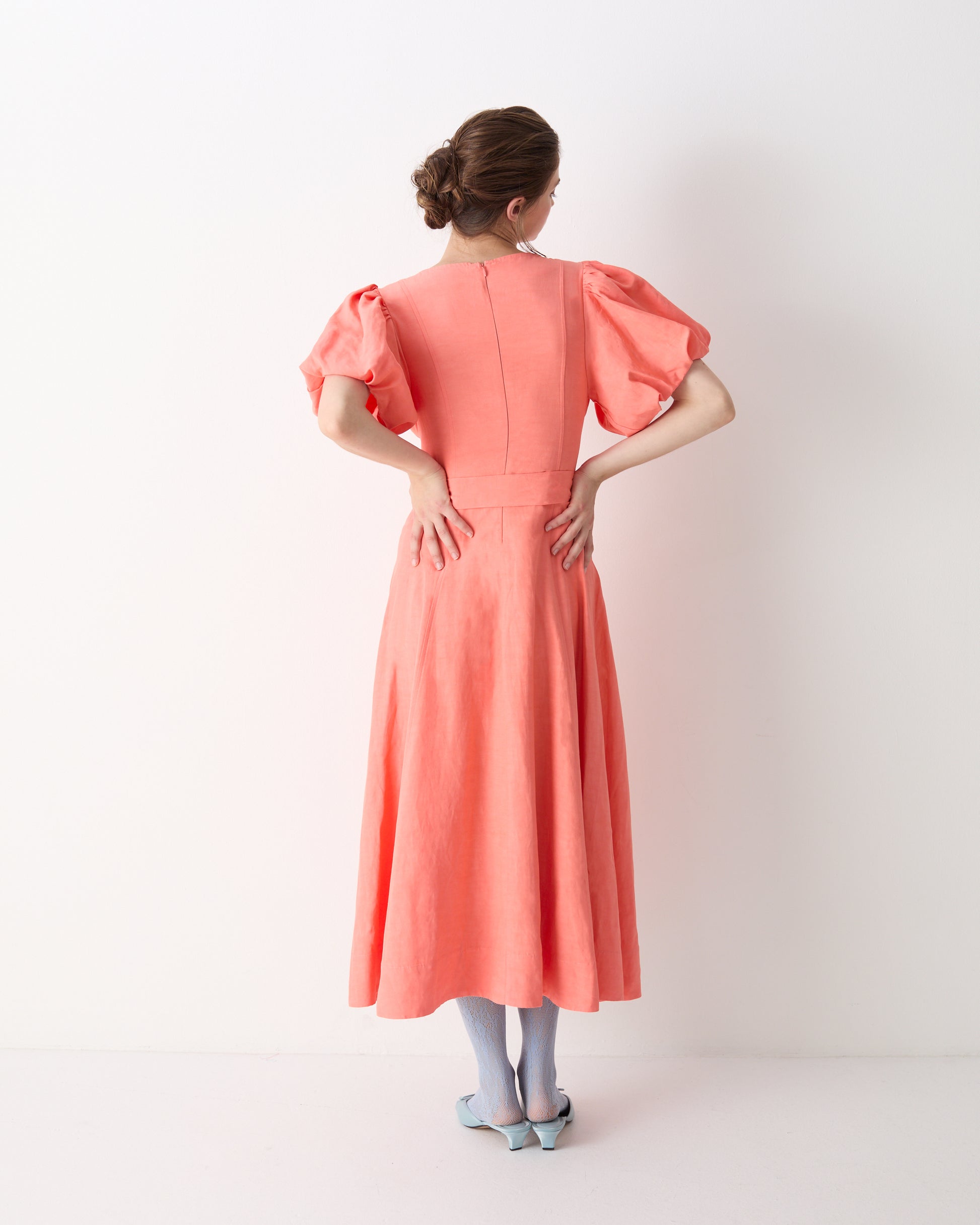 It's the vibrantly gorgeous apricot colour that transforms our Nadia Midi dress, taking a simple silhouette and elevating it into a piece designed to turn heads. Inspired by the heat of summer dahlias, the dress is crafted from our silk/ linen blend and features full sleeves, a panelled waistline and a fabric belt. Ideal for any summer party and guaranteed to grab attention.