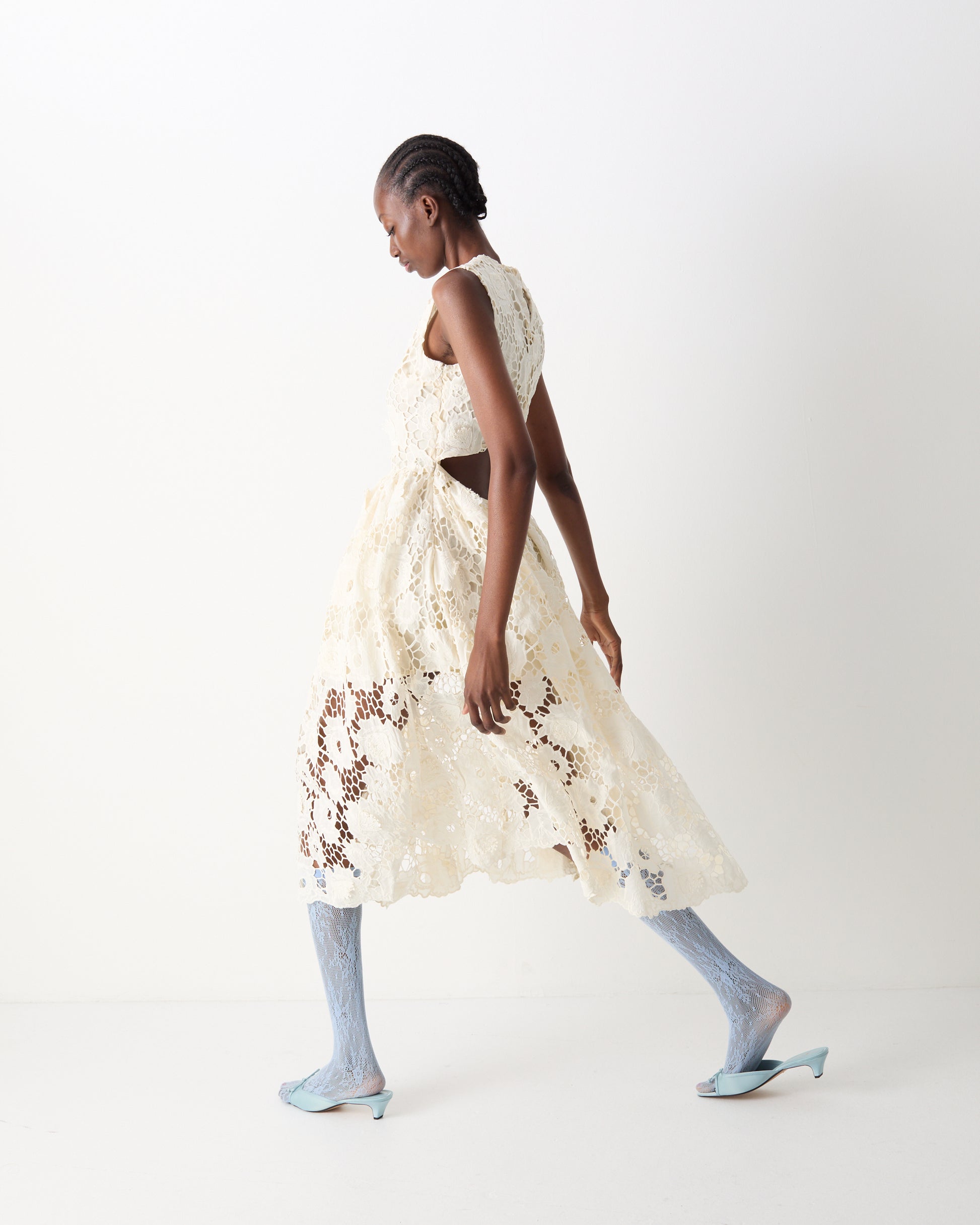Our ivory Selma Midi dress takes a romantically nostalgic shape and slices a panel from the back to subvert the sweetness and bring in a sense of modernity. With no additional adornments except the Peonies that bloom across the ivory lace, the Selma Midi Dress is sure to become a modern classic, elegantly but sweetly moving from occasion to occasion.