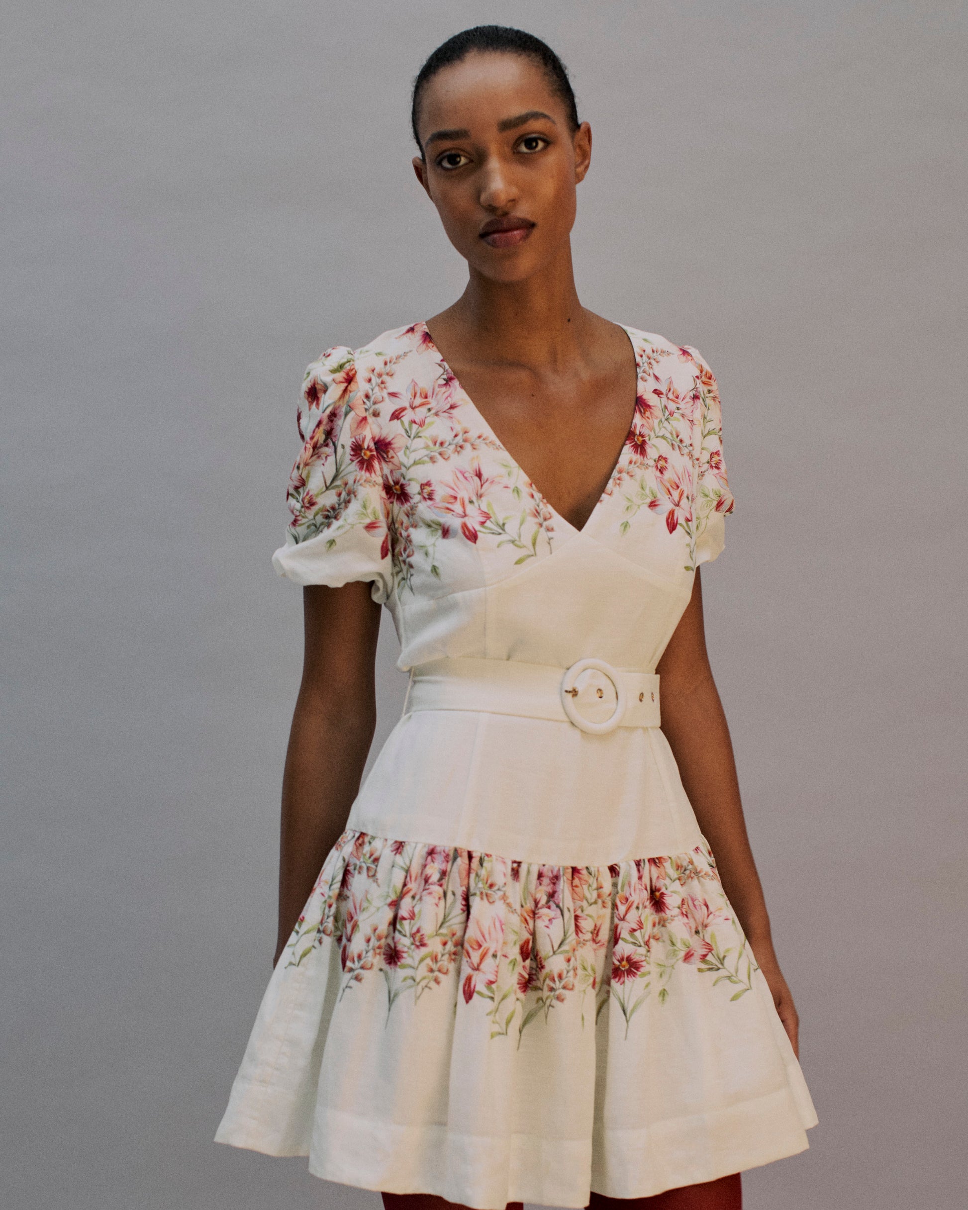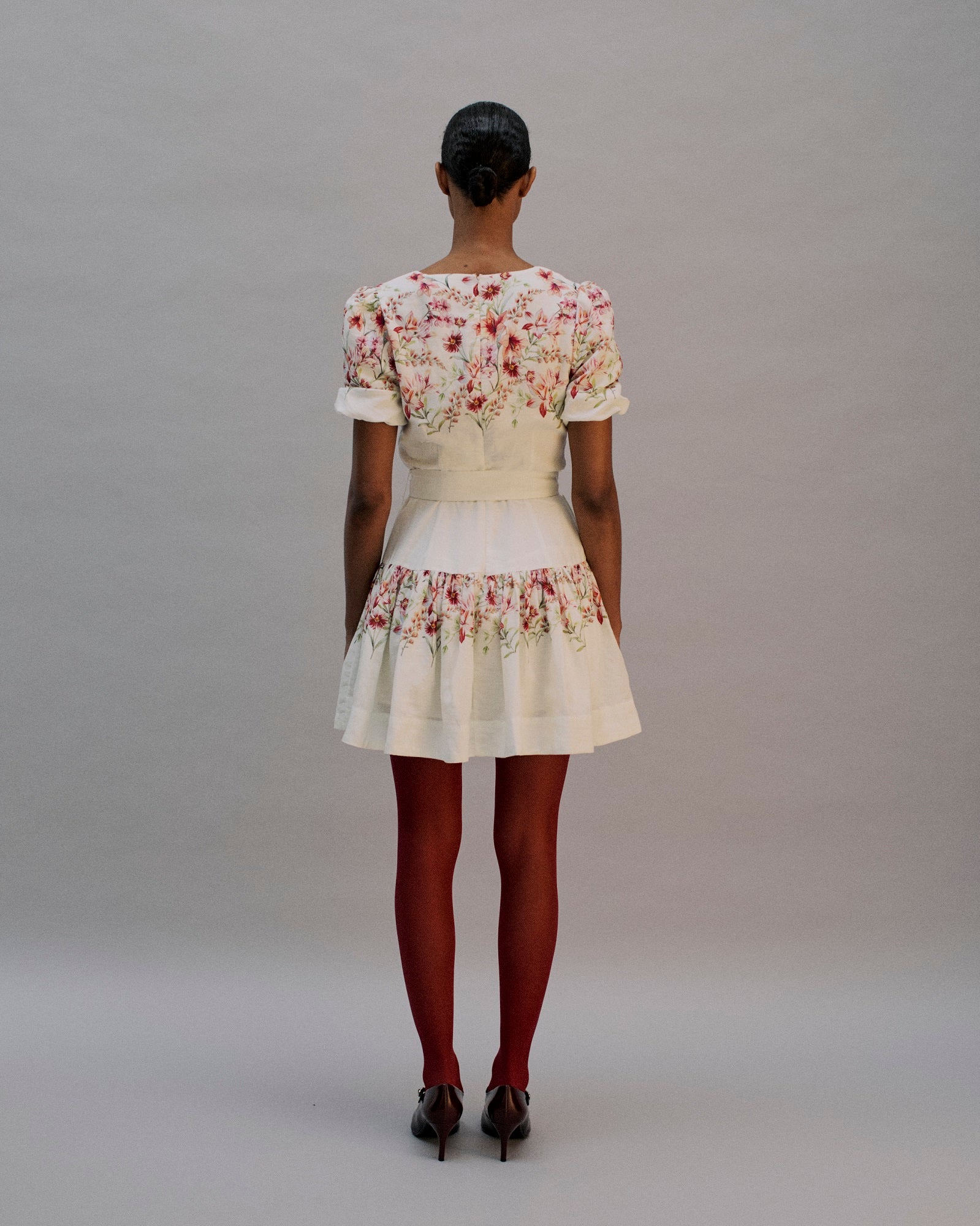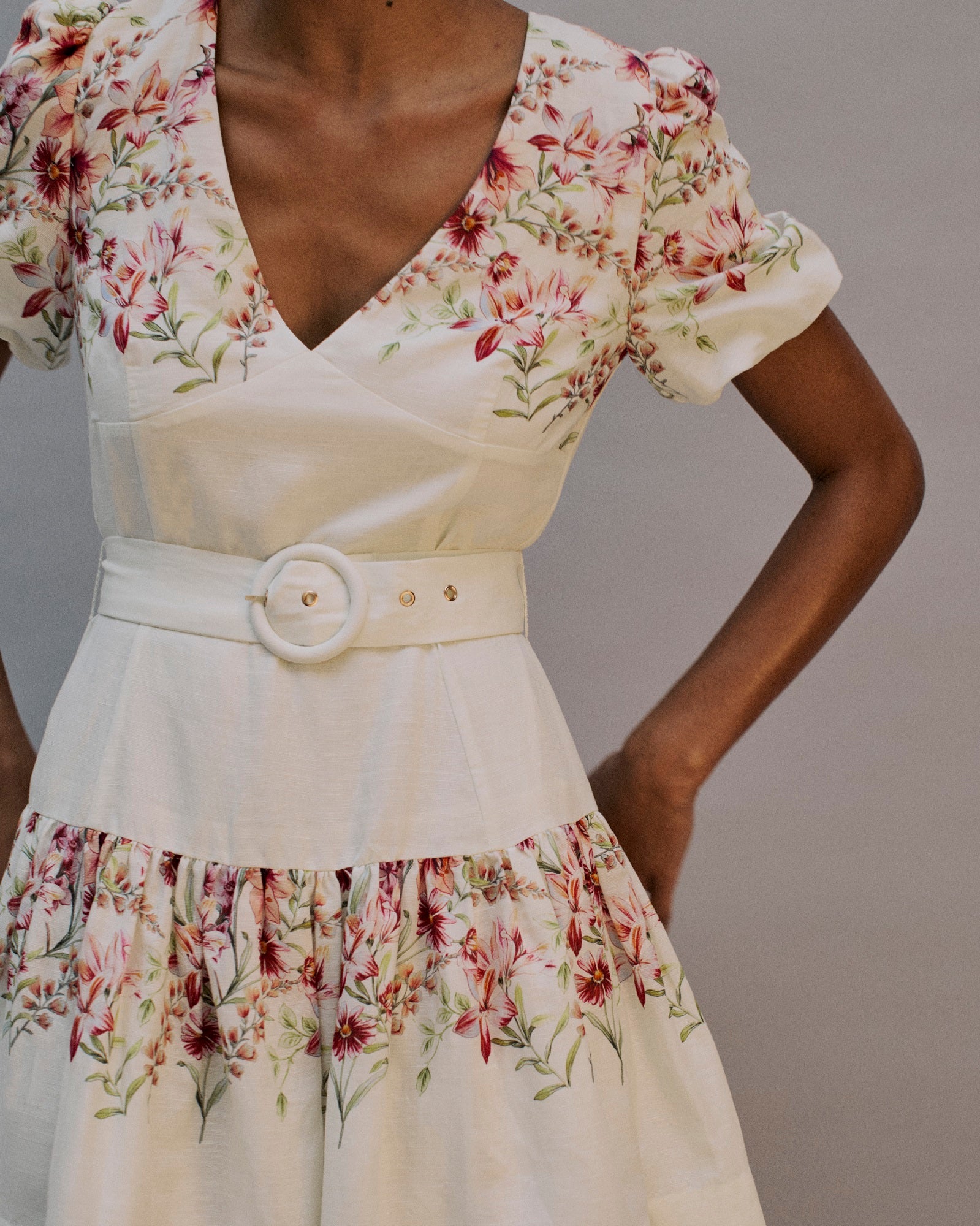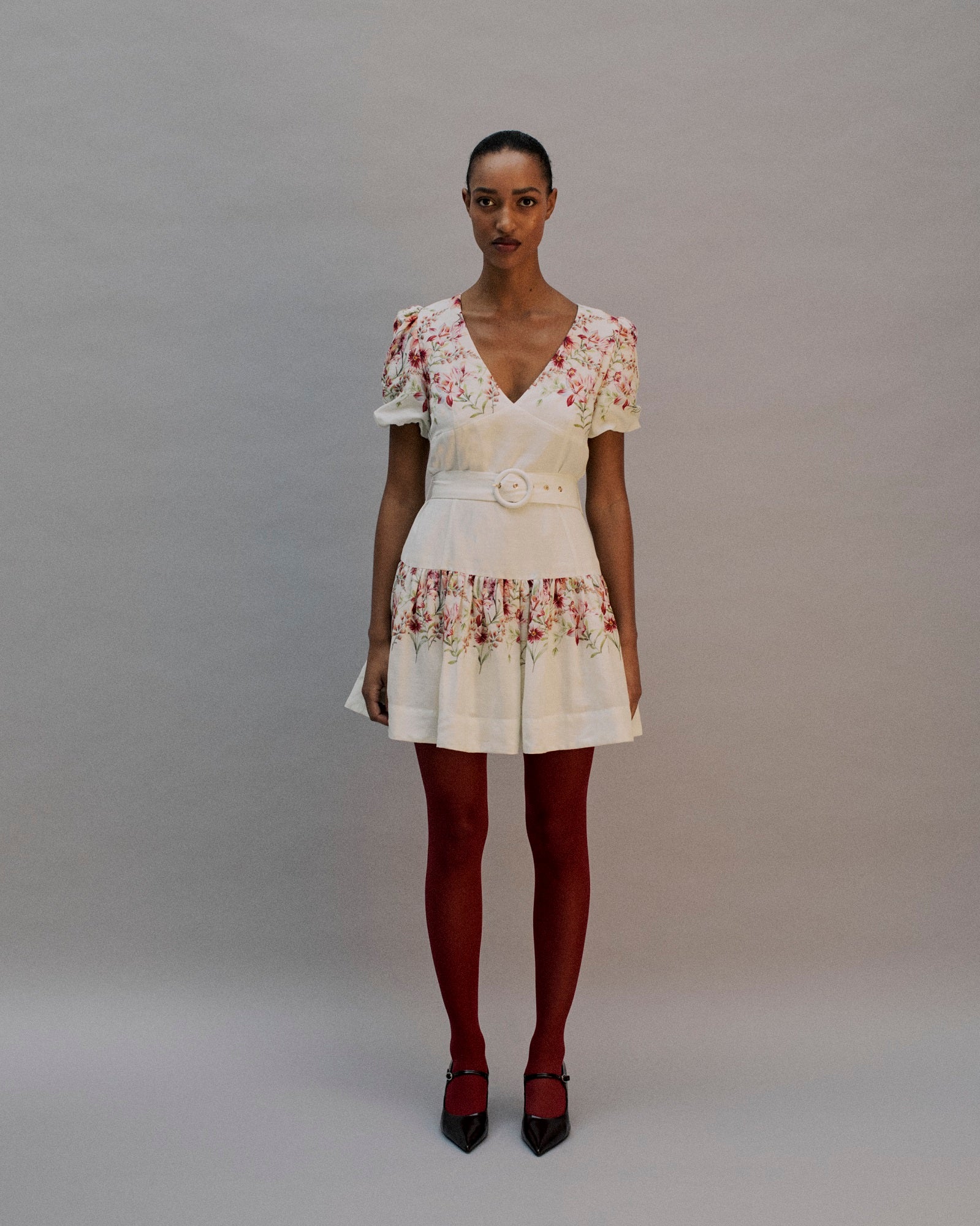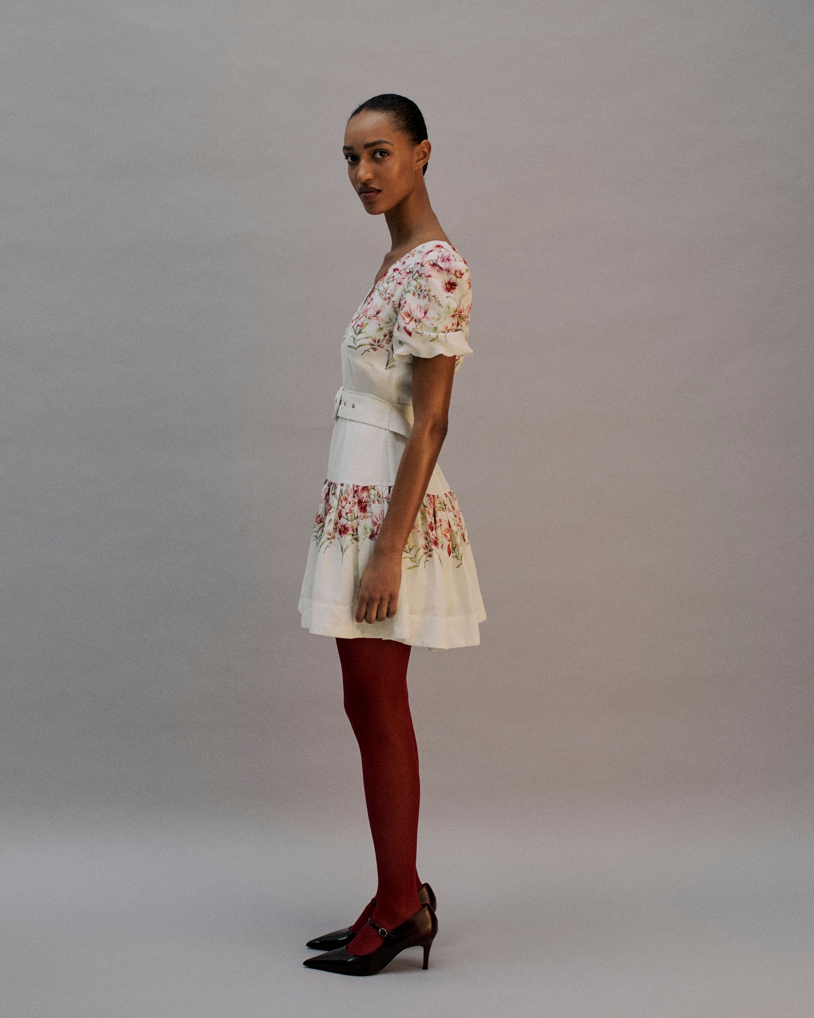 The Nola Mini Dress in the Garden Bloom Print combines elegance with a fresh, summery vibe. Crafted with a full skirt and gently puffed sleeves, it creates a flattering silhouette enhanced by a waist-defining belt. The exclusive Garden Bloom Print adds a distinctive, romantic touch, making this dress an ideal choice for a variety of occasions where style and comfort are essential.