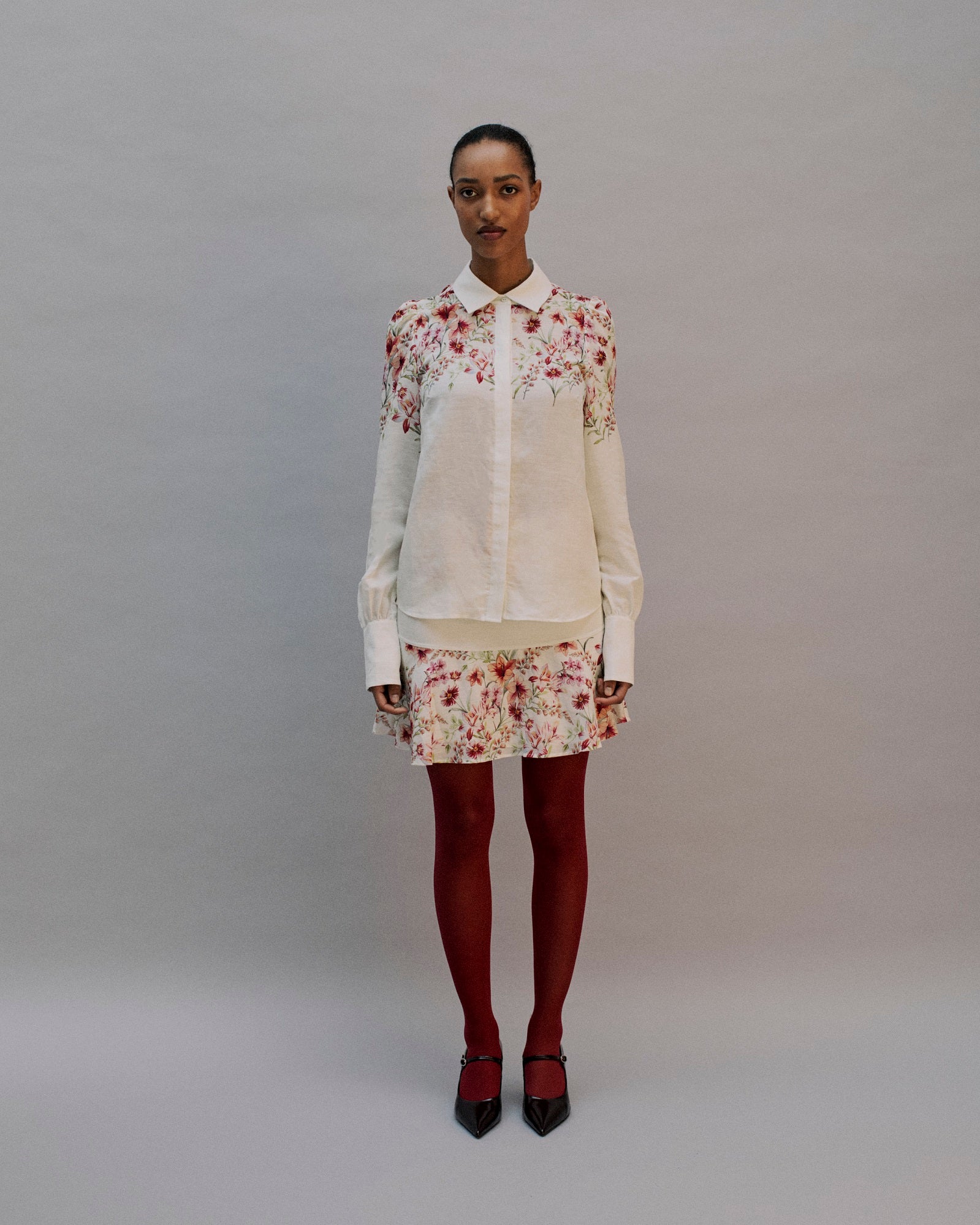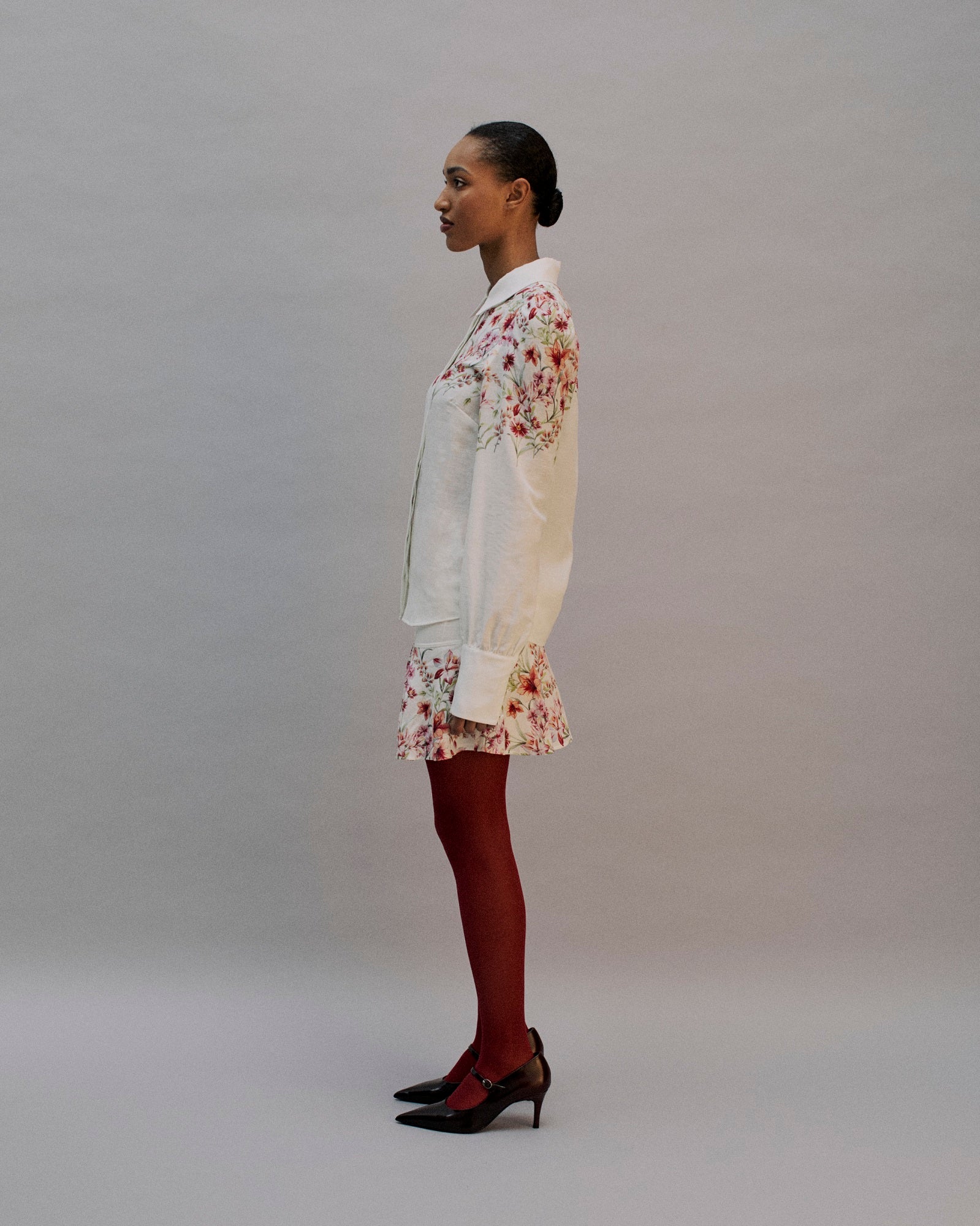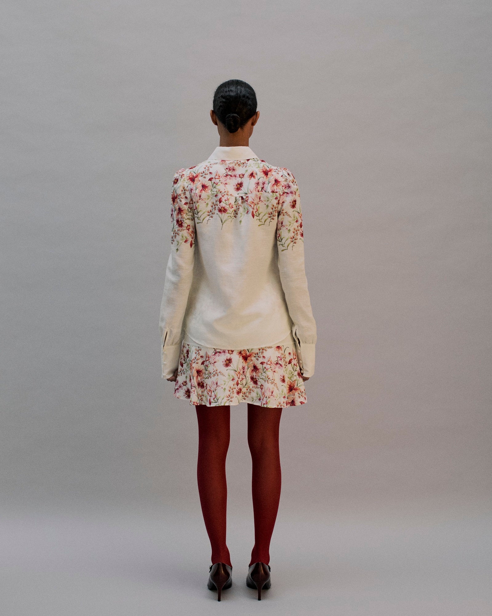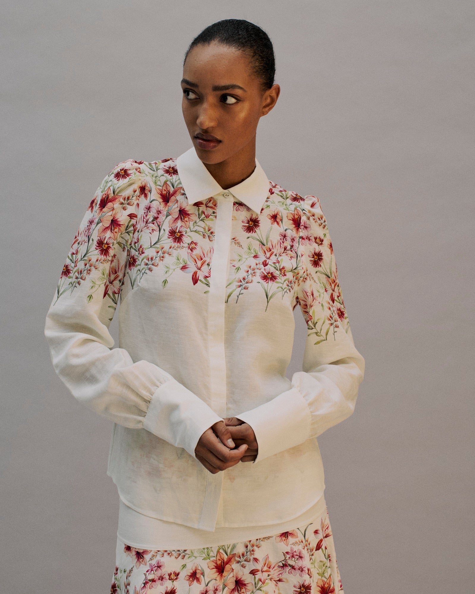 The Mathilde Shirt in the Garden Bloom Print features a refined romantic silhouette updated for Pre Fall 25 with softly billowing sleeves and deep cuffs for an elegant finish. The exclusive Garden Bloom print, showcasing dahlias and day lilies, graces the shoulders, adding a delicate botanical touch. Expertly designed to pair seamlessly with the matching skirt, this shirt offers a sophisticated yet playful option for summer coordination.