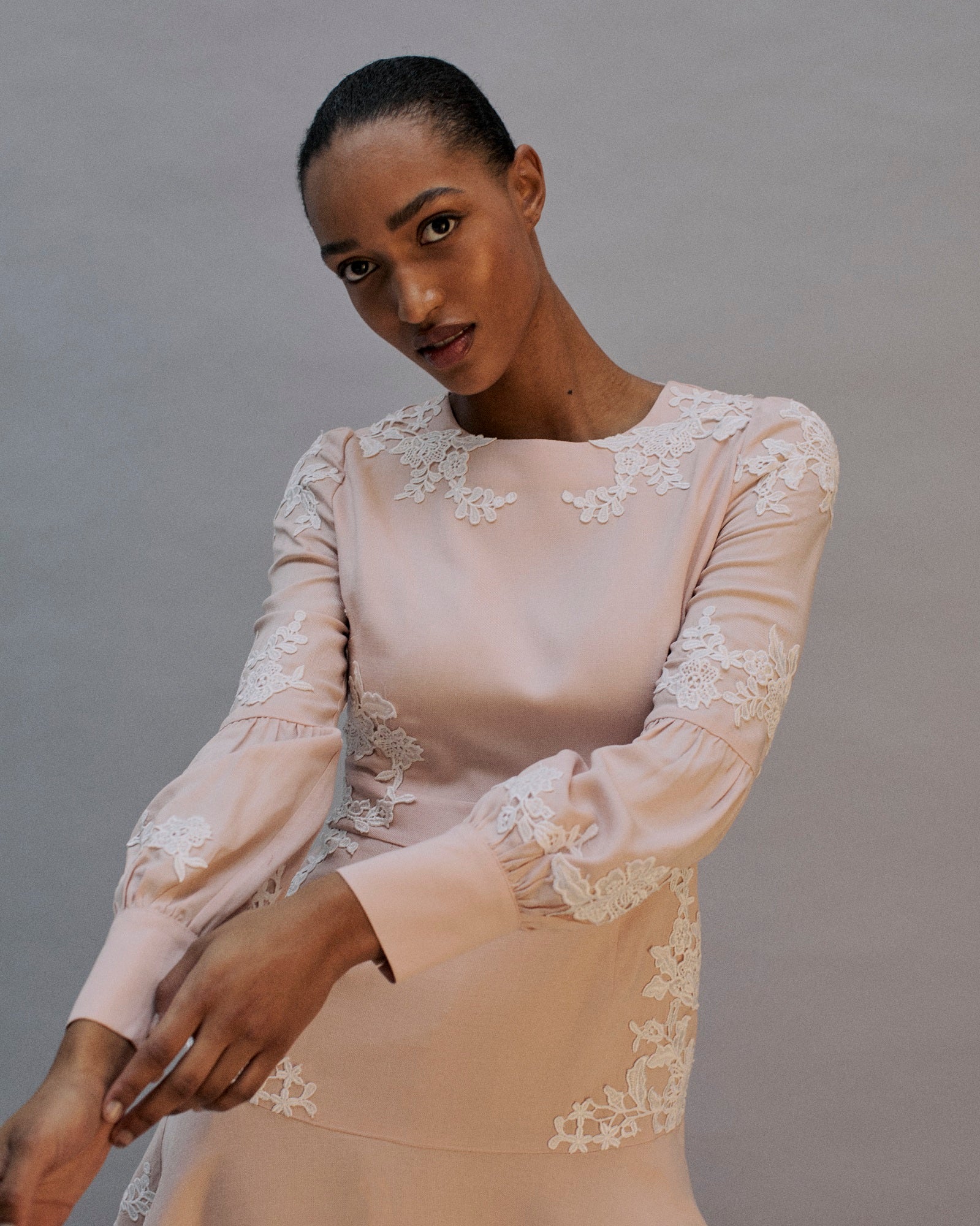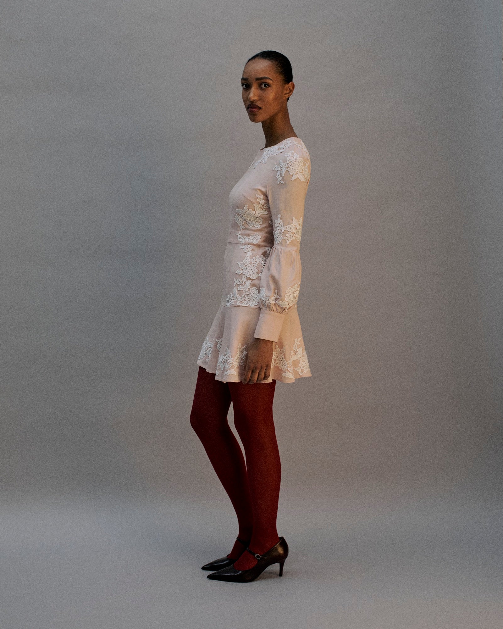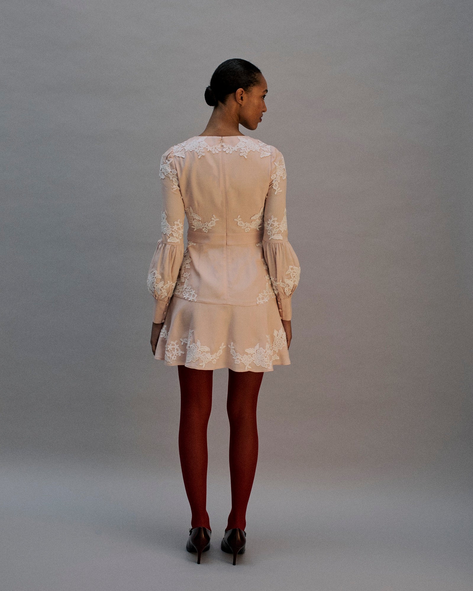 The Lotta Mini Dress in Blush features intricate lace appliqué that enhances its refined design. Its playful, short hemline introduces a contemporary flair, perfectly balanced by a sophisticated blush tone that suits a range of occasions. Expertly tailored, this dress combines elegance with youthful vibrancy, making it a versatile addition to any wardrobe.