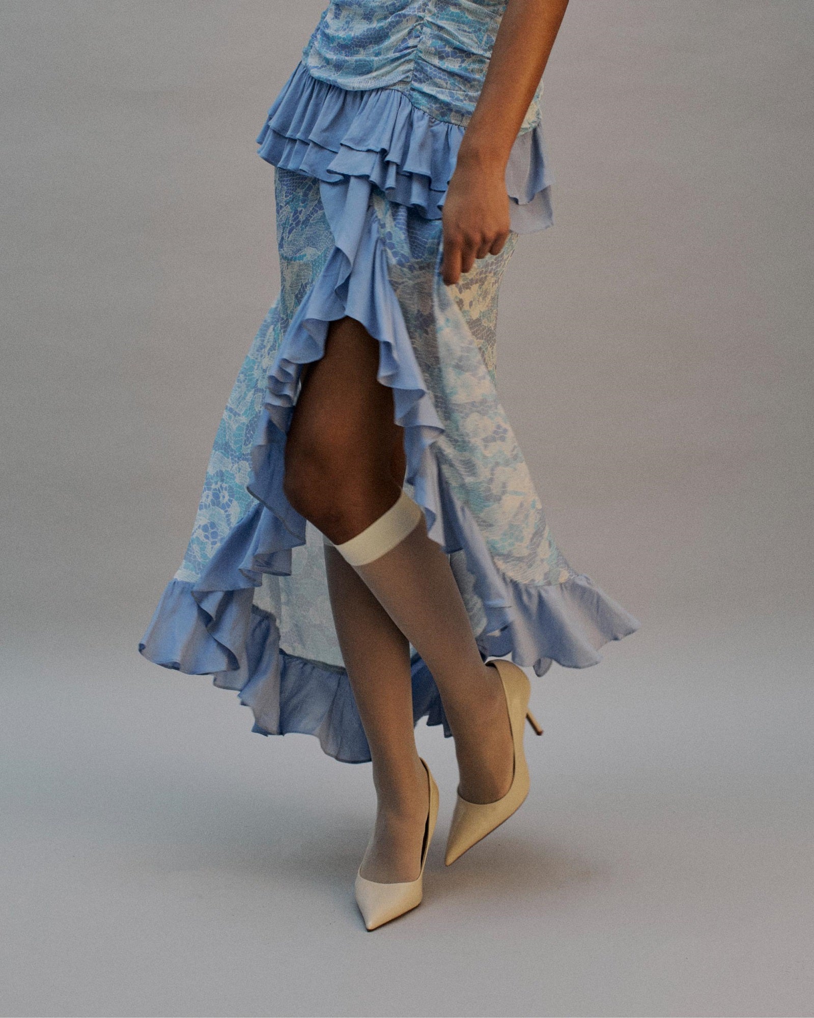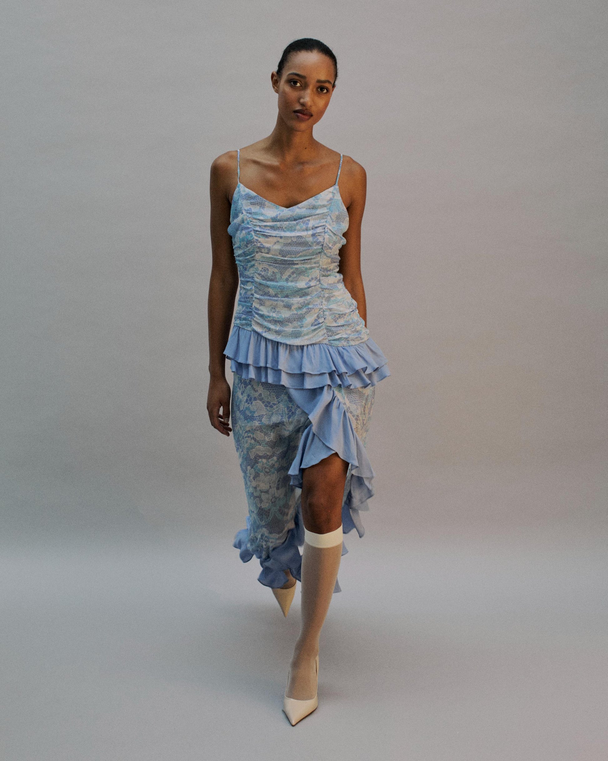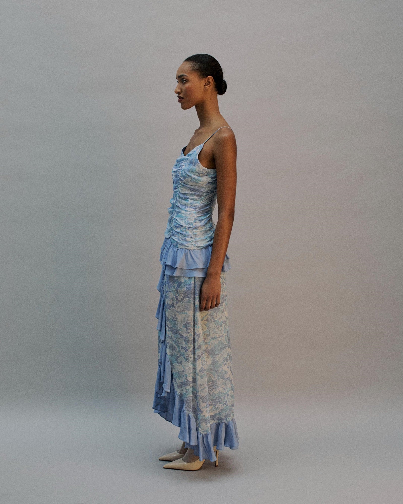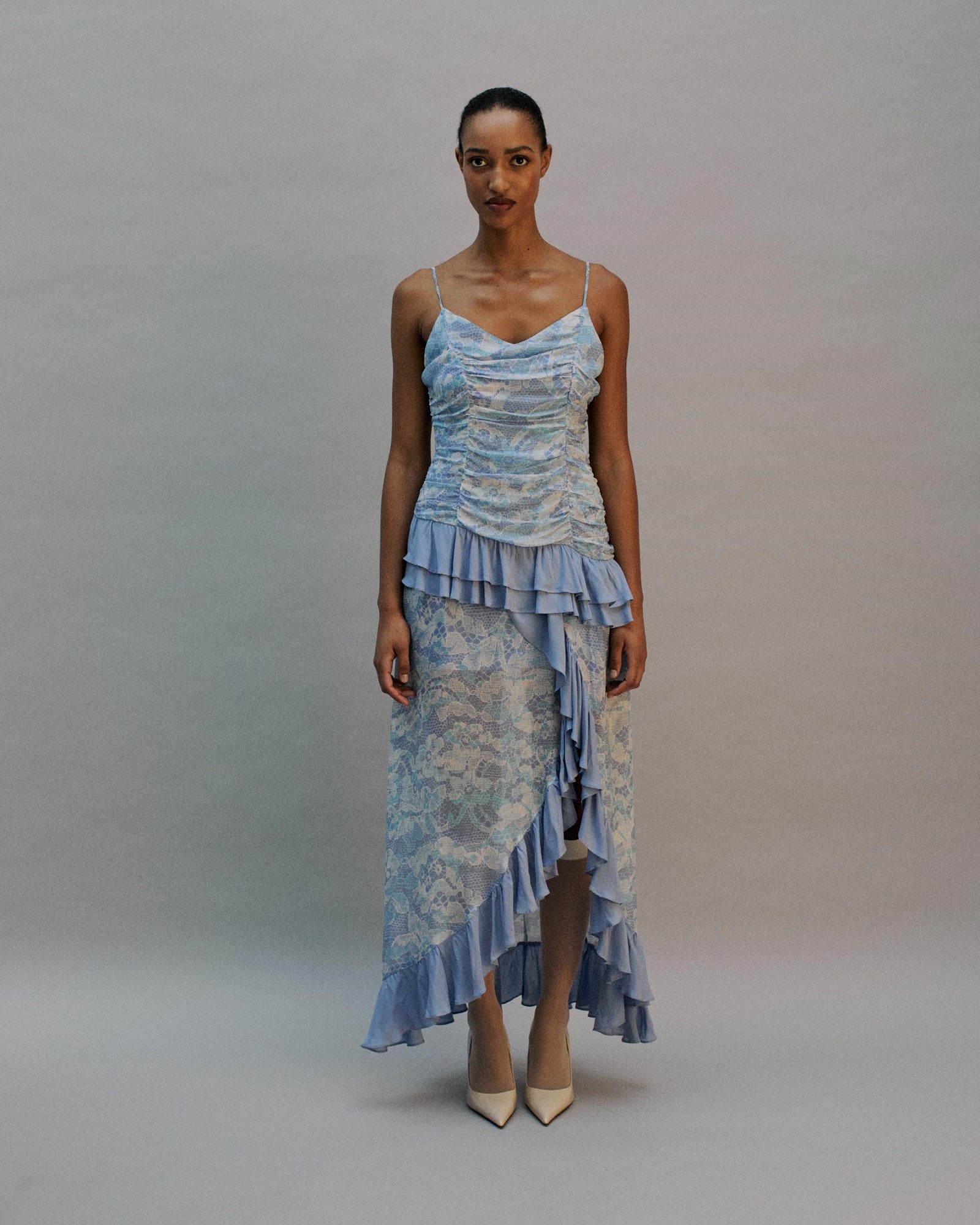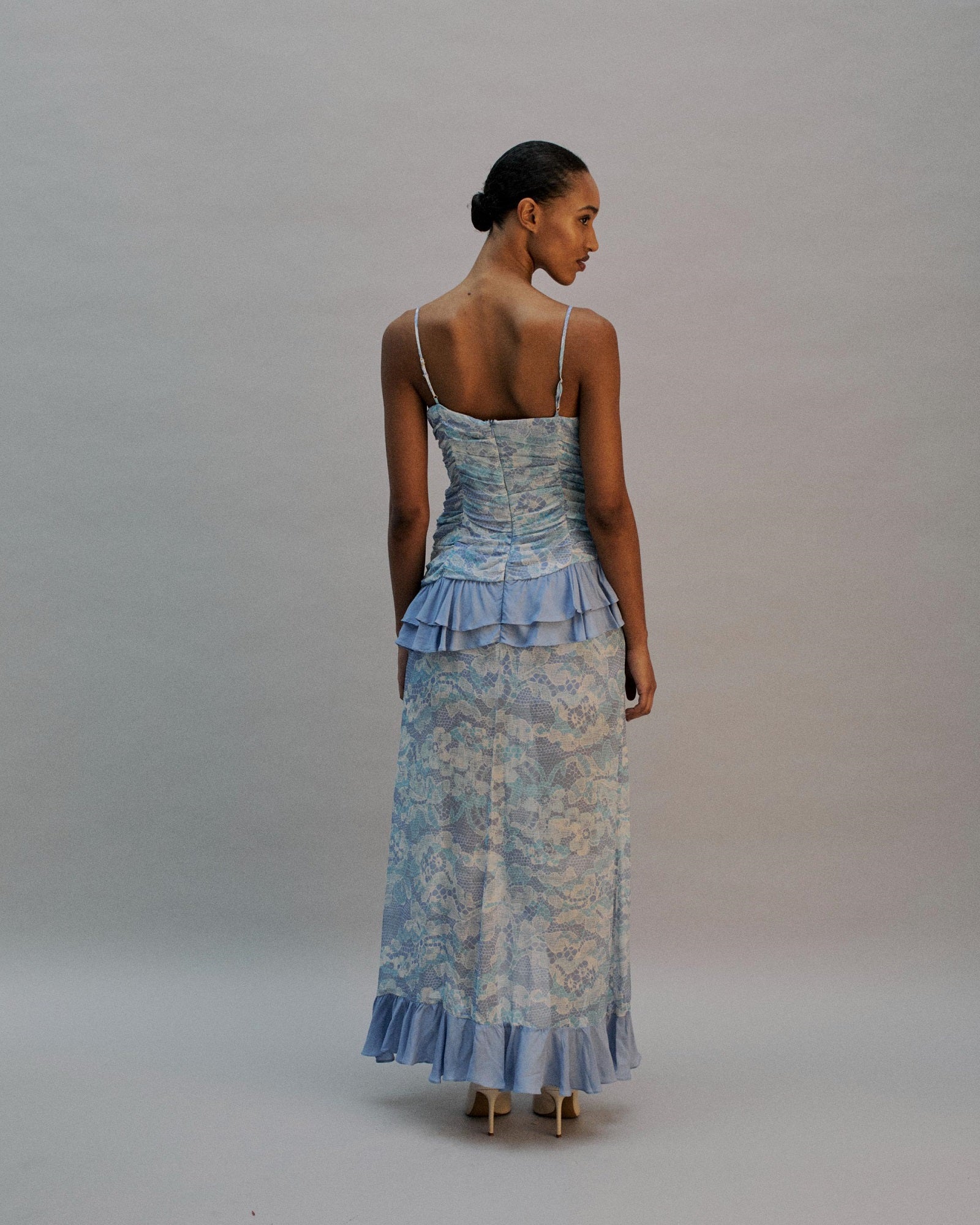 The Freya Maxi Dress in Bluebell Lace Print combines intricate lace with subtle transparency for a refined, modern feminine look. Its mock wrap design and ruched bodice create a flattering silhouette, while delicate strap details and frill accents add romantic charm. Rendered in a soft blue, this dress offers an elegant balance of texture and structure, ideal for sophisticated occasions.