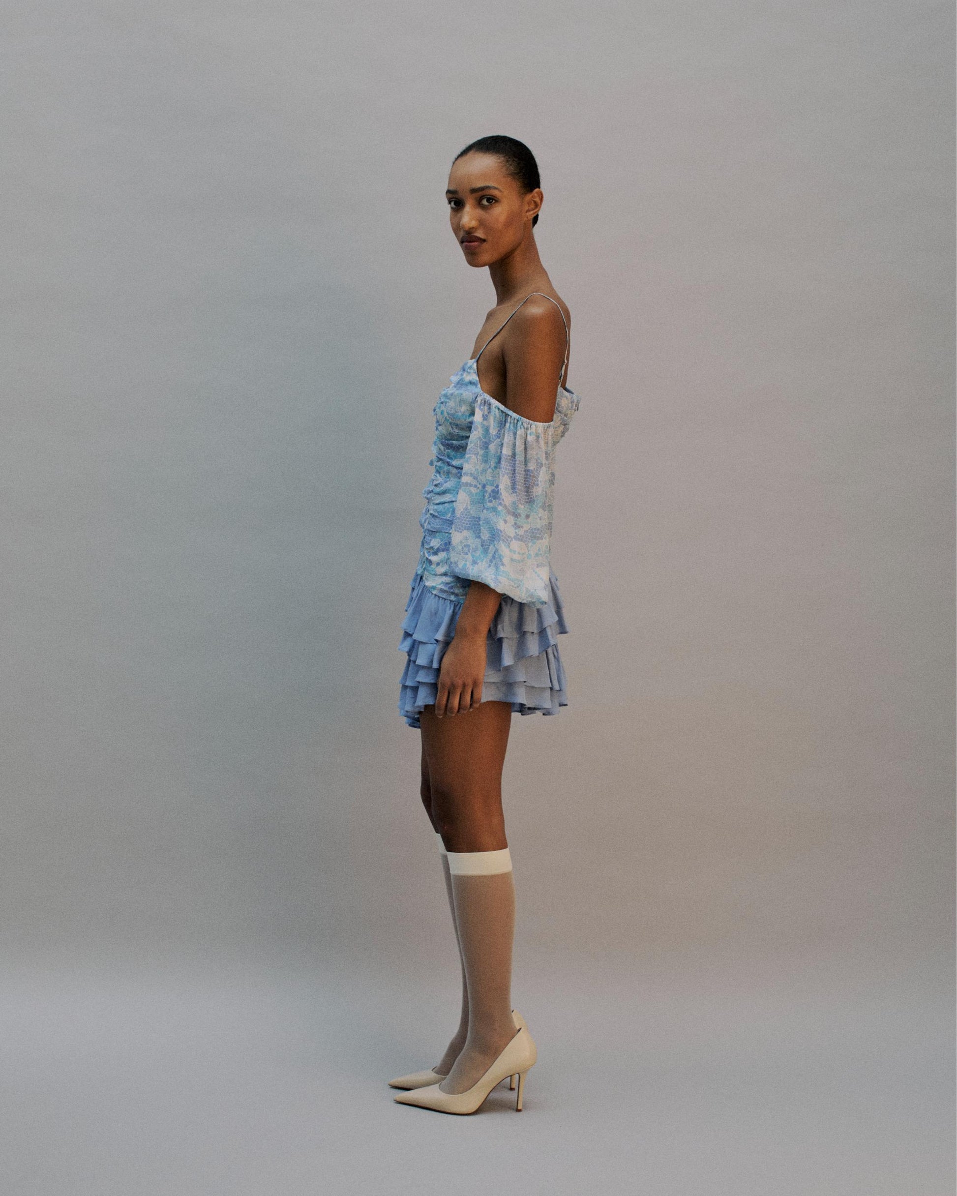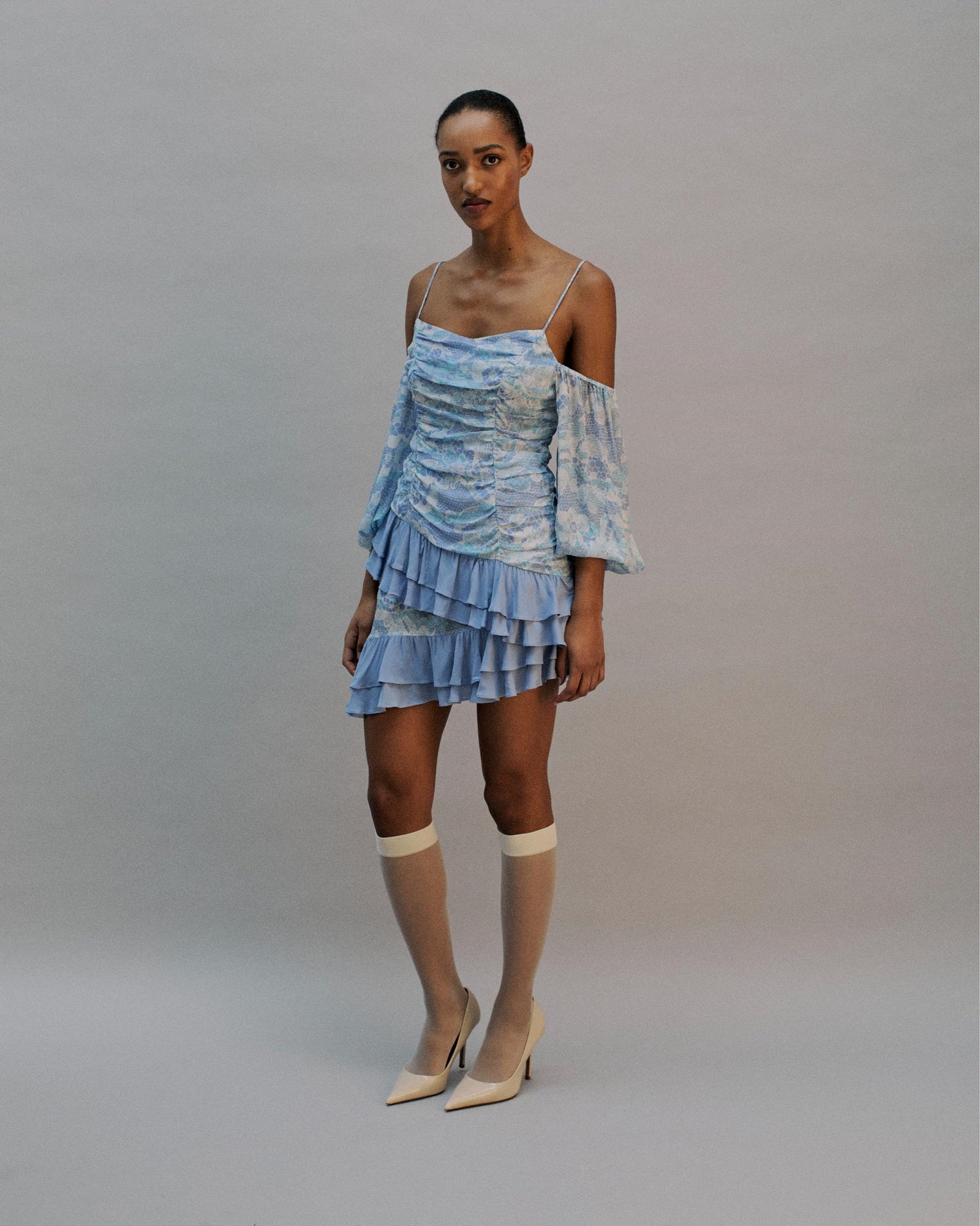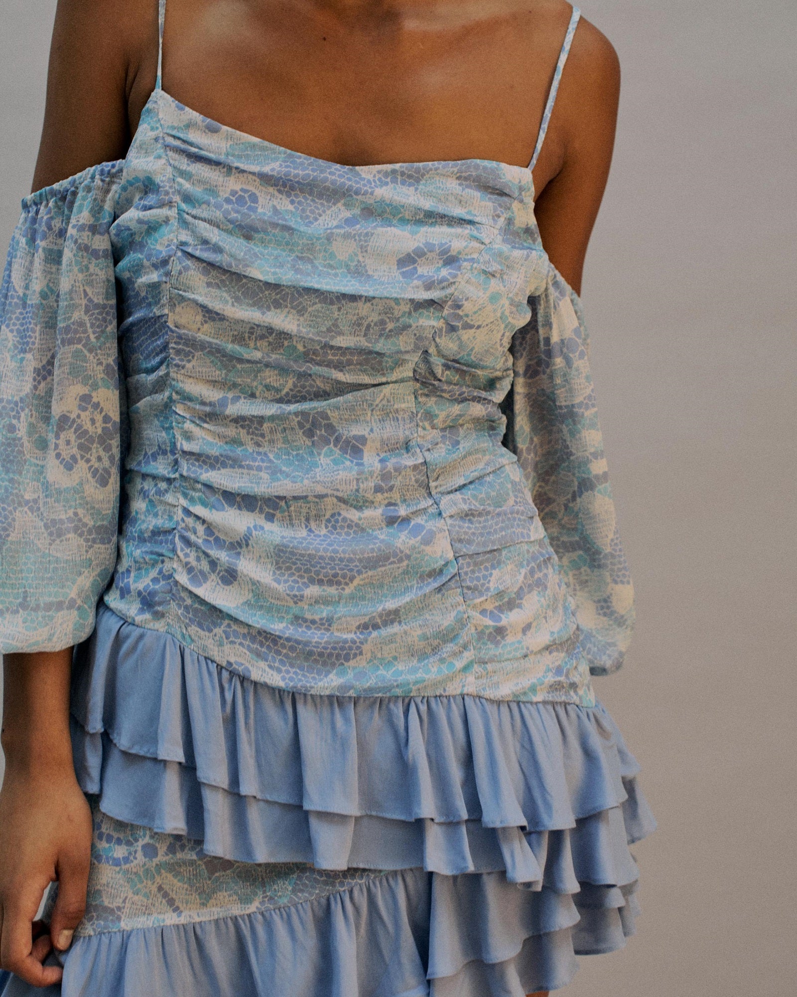 The Phoebe Mini Dress in Bluebell Lace Print combines a delicate lace pattern with subtle transparency for a flirtatious, feminine look. Its off-shoulder design and ruched bodice enhance a youthful silhouette, while frill details add a charming, playful touch. In a soft duck egg blue, this dress is perfect for parties, offering a pretty and sophisticated style that stands out with effortless elegance.
