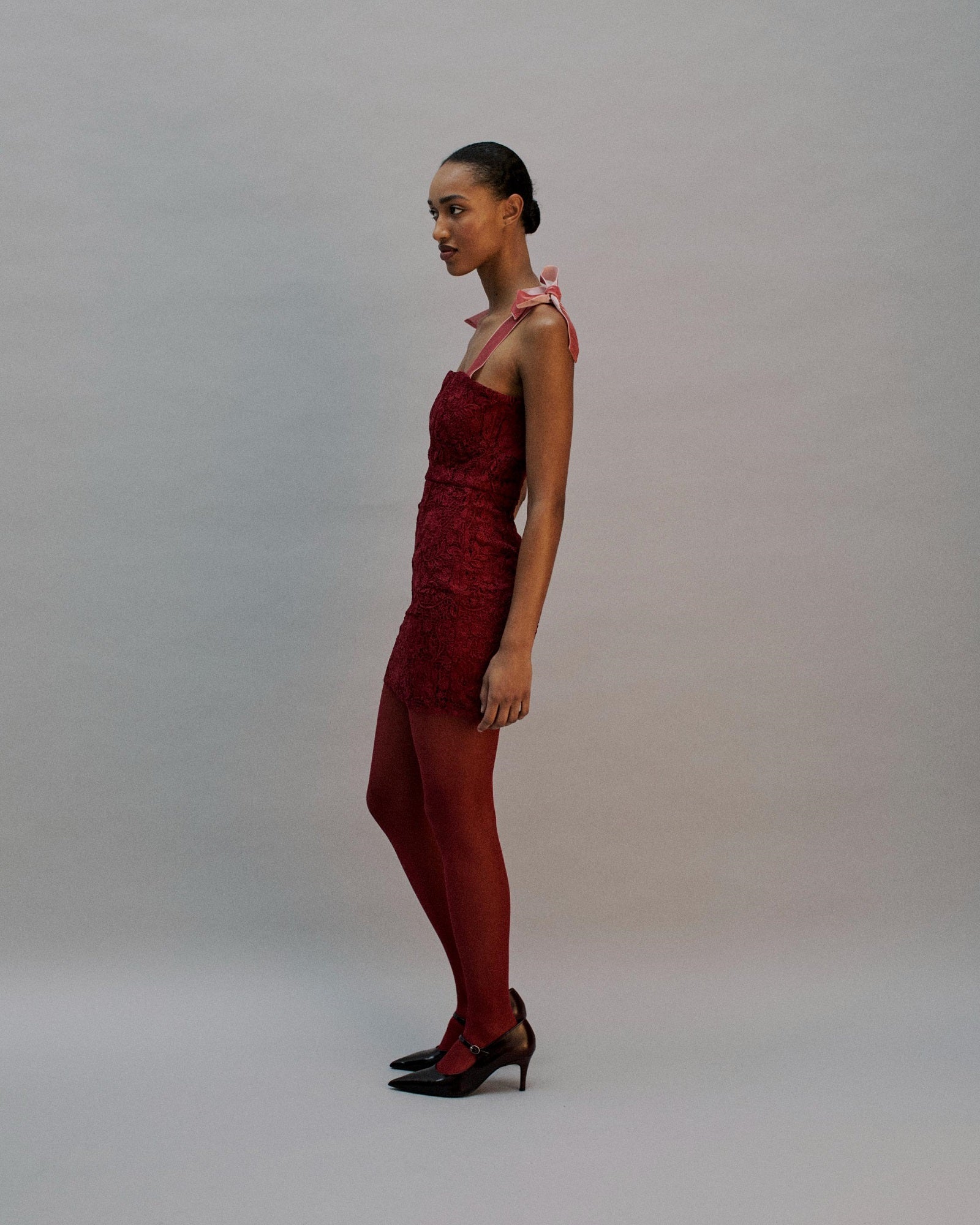 The Gigi Mini Dress in Cherry Lace captures a daring spirit with its playful mini length and delicate velvet bows. Crafted from vibrant cherry lace, this dress radiates flirtatious charm and modern elegance, perfect for those who want to express joy and confidence in every step.