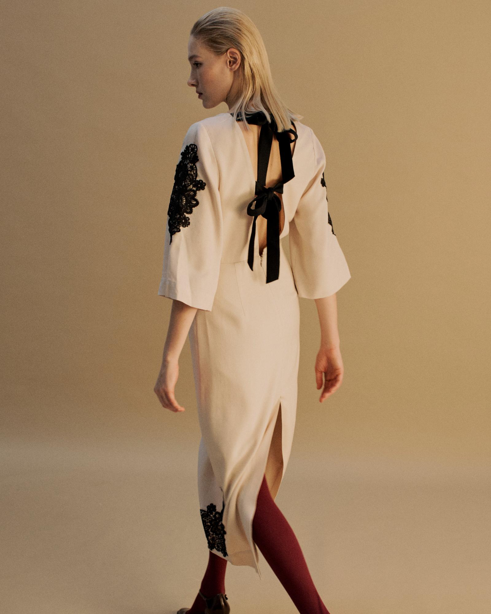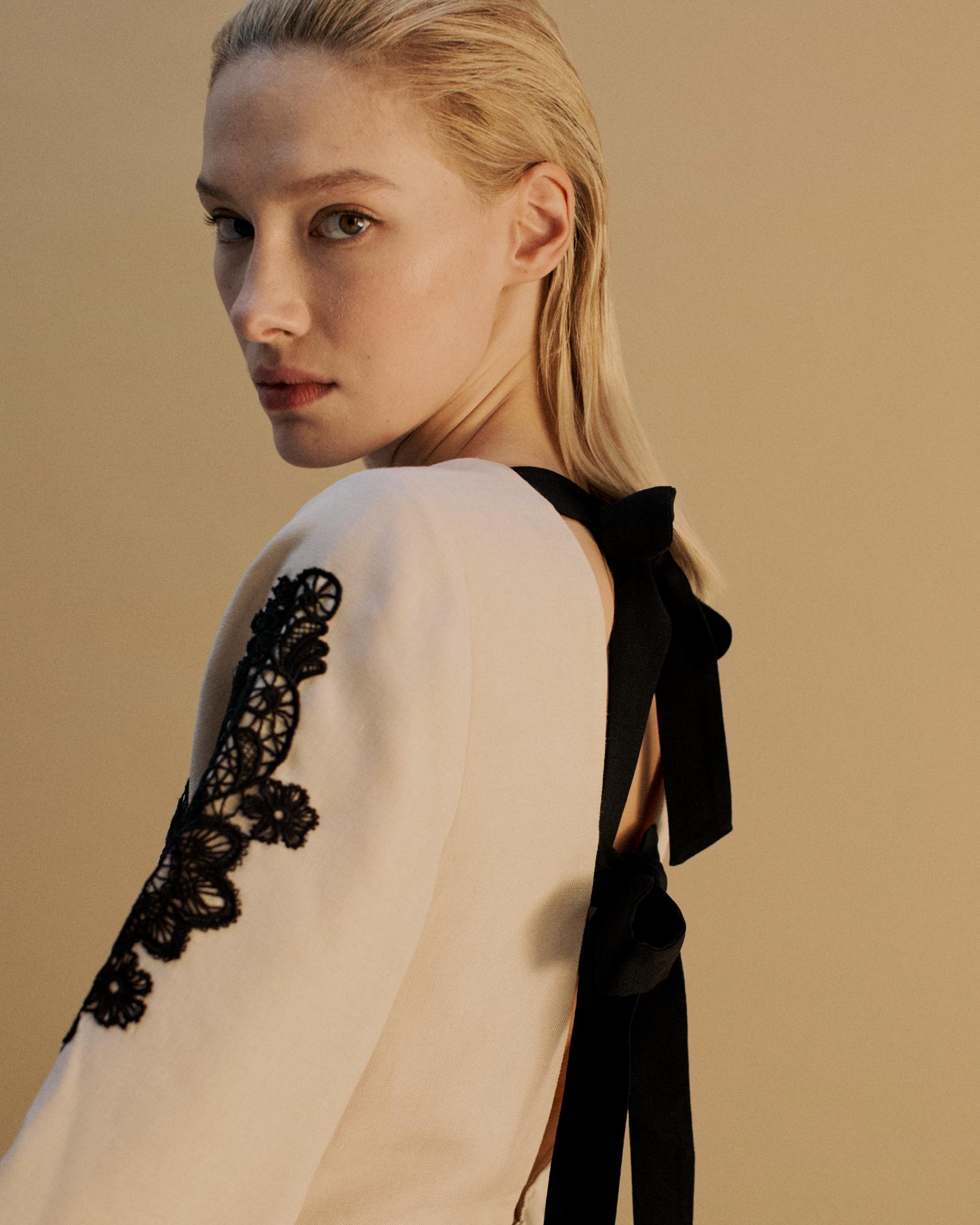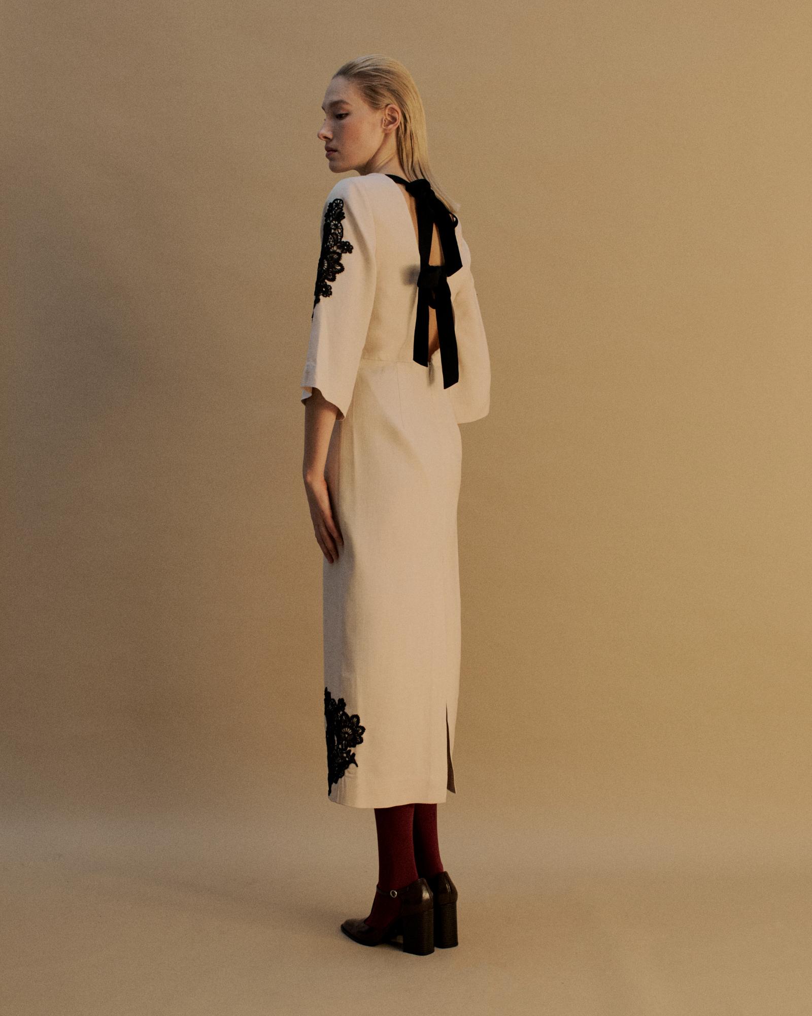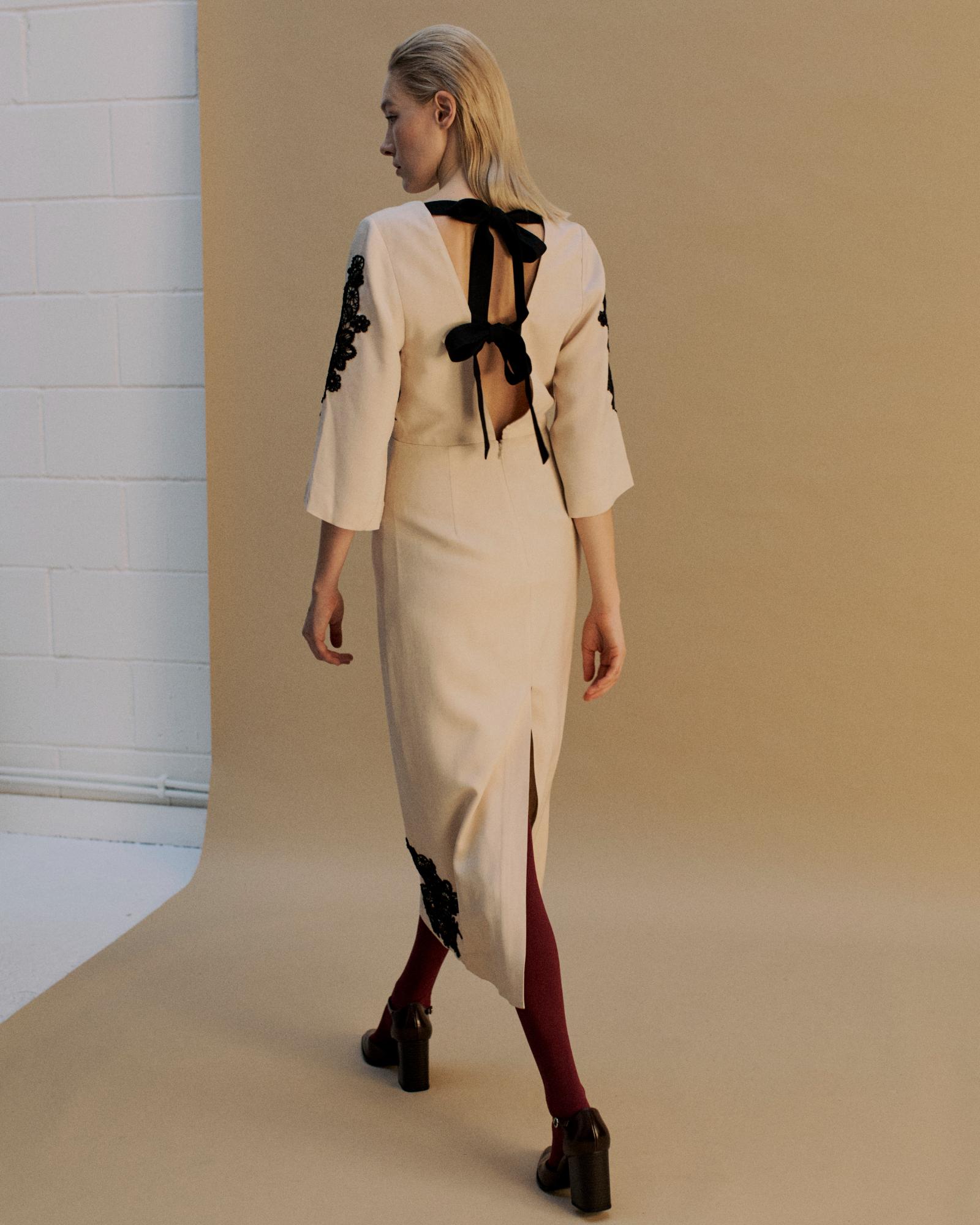 The Natalia Midi Dress in Canvas with Black Lace combines daring elegance with modern femininity. Featuring appliqued black lace and striking black tie-back details, this form-fitting dress accentuates your silhouette with contemporary style. Perfect for making a bold statement, it blends classic craftsmanship with a fearless edge.