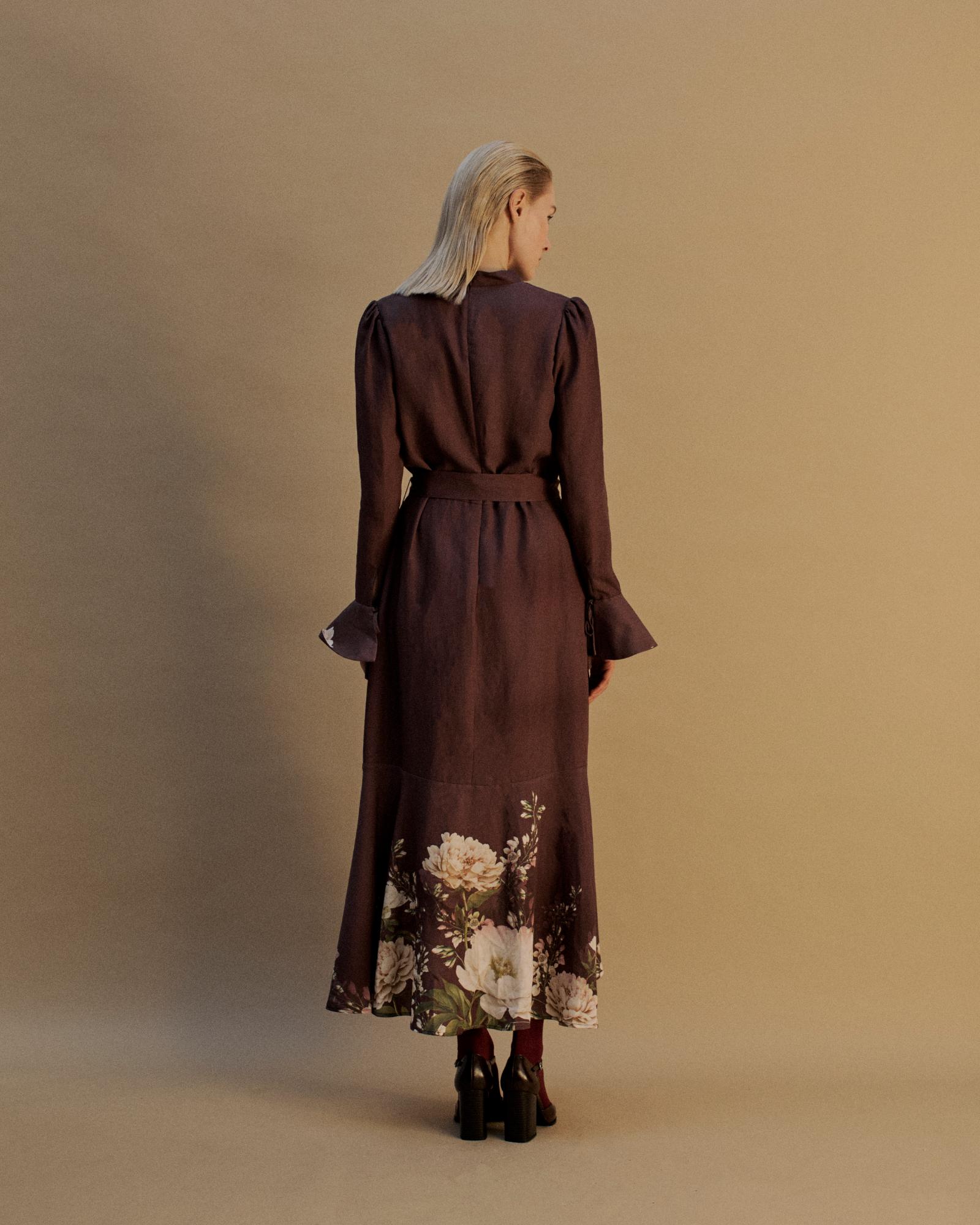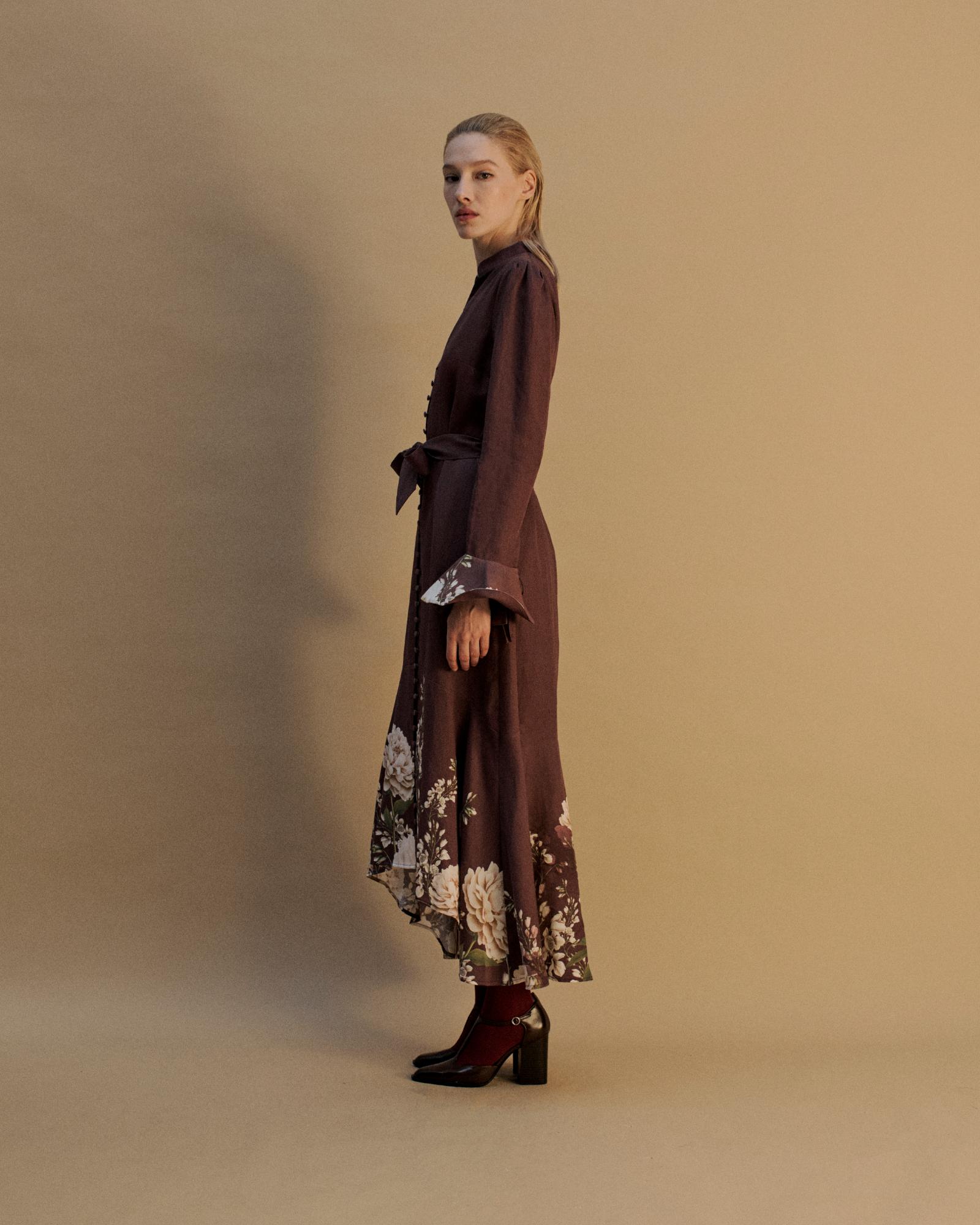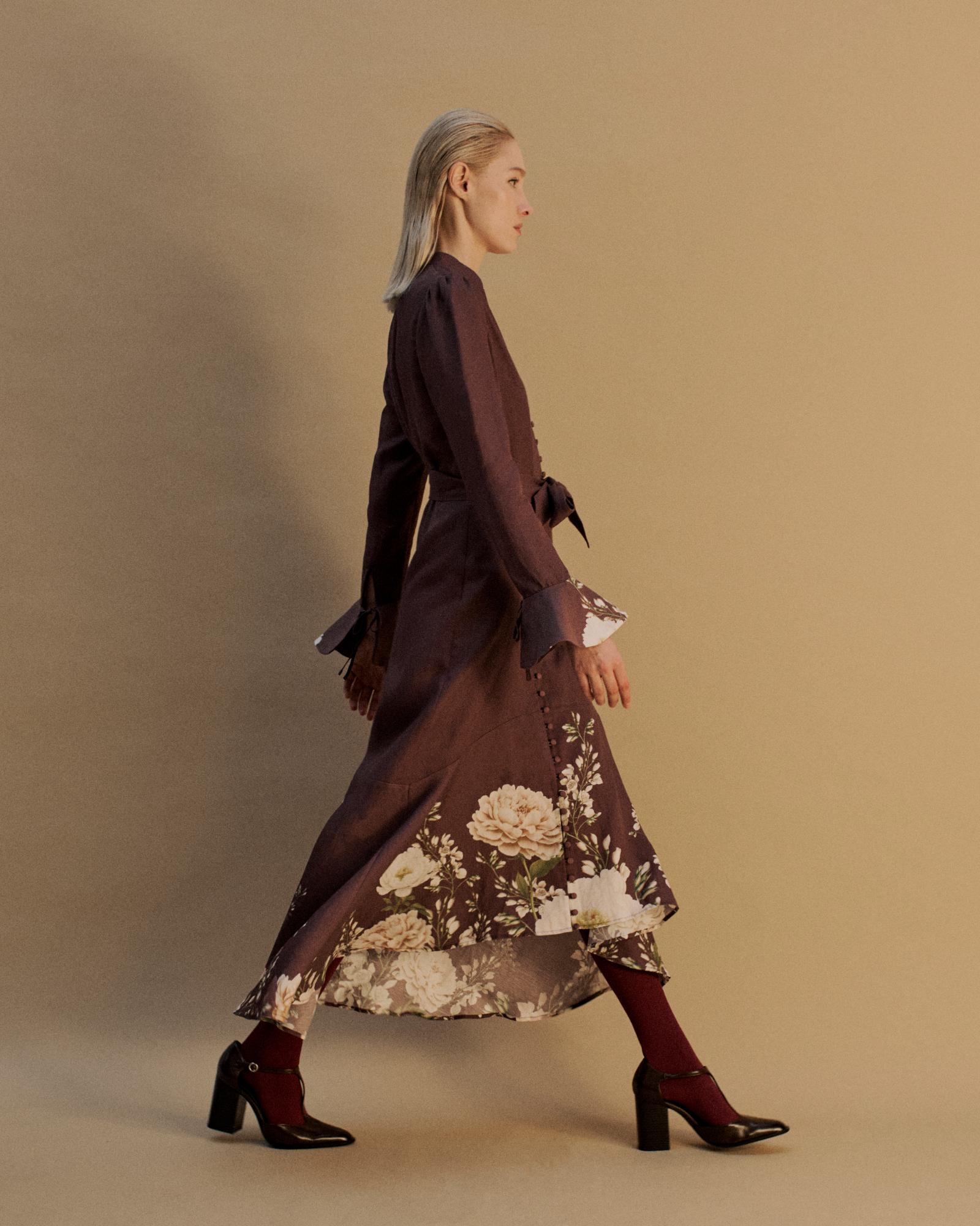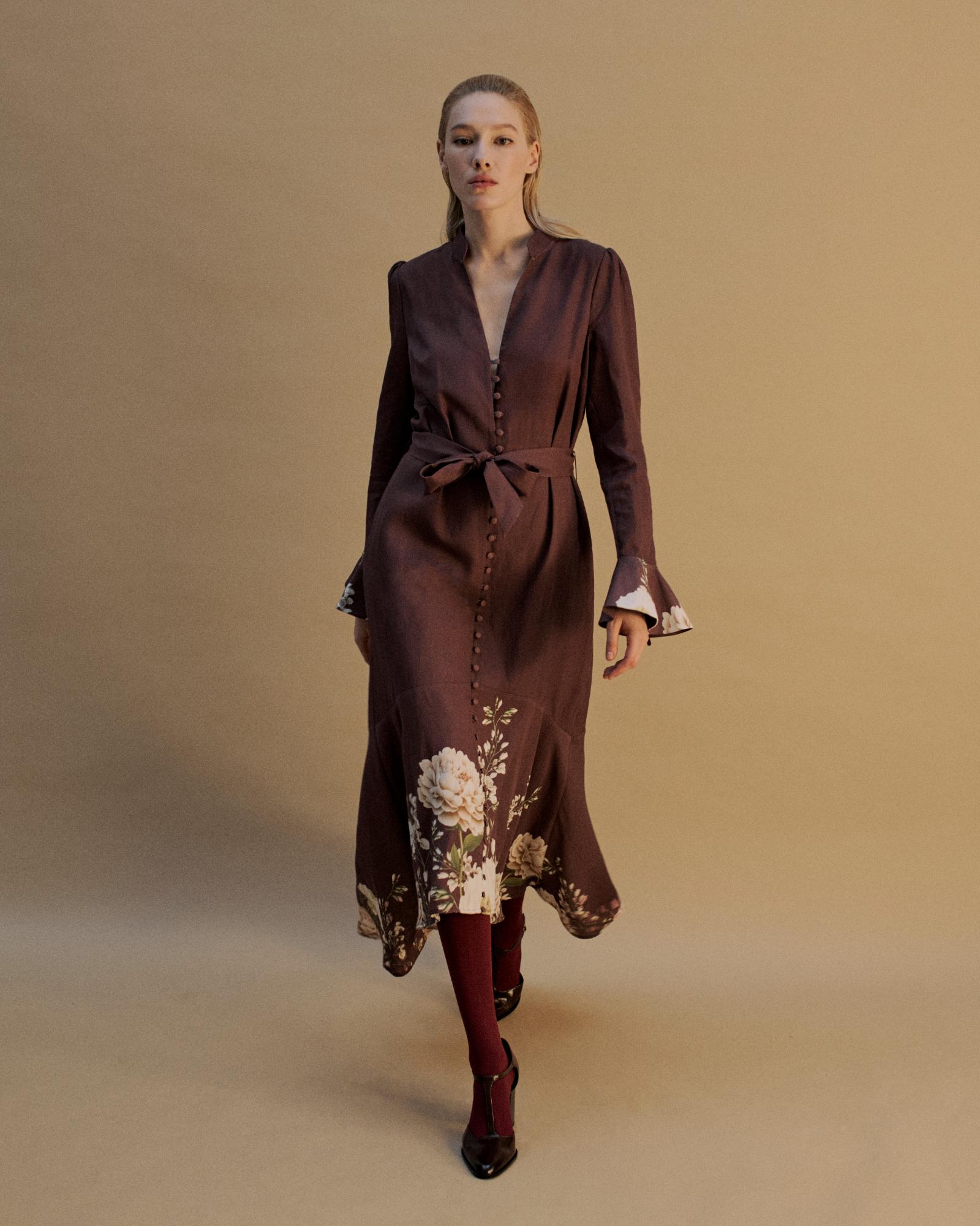 Make a striking statement in the Carmen Midi Dress, featuring a stunning romantic peony print artfully placed at the hem. The deep aubergine color intensifies its daring appeal, while button-through details and fluted cuffs add unique, bold accents. Designed with a flattering fit, this dress combines elegance and edge for a look that commands attention.