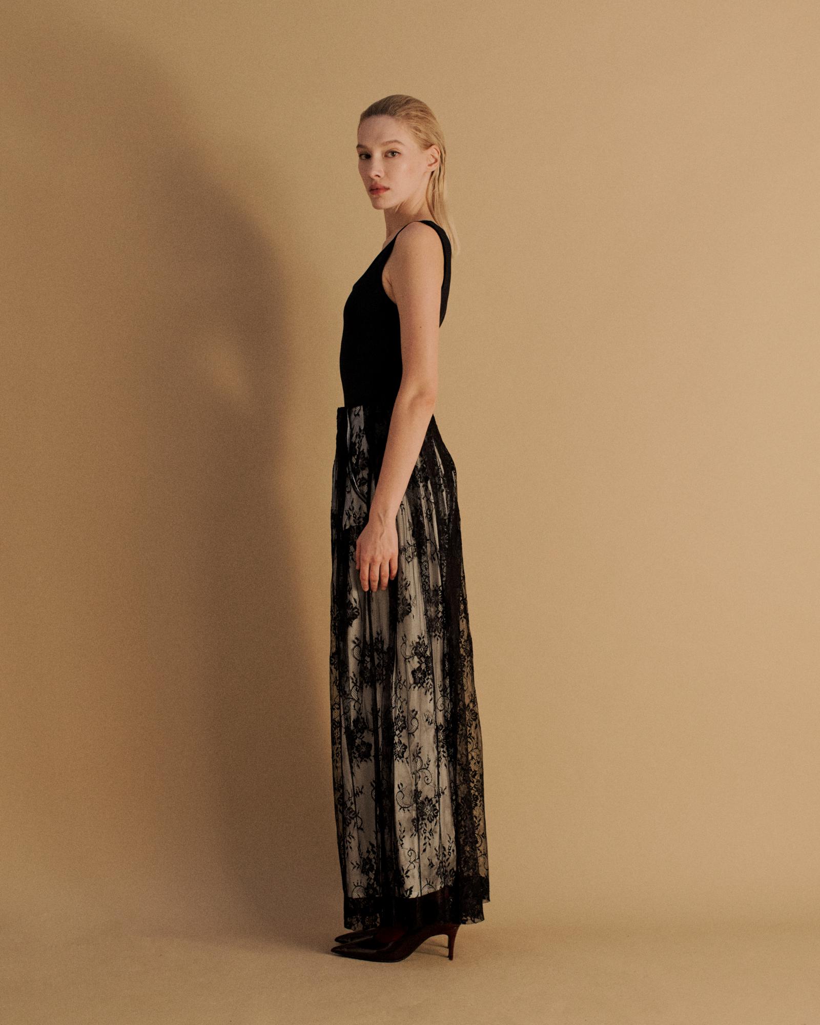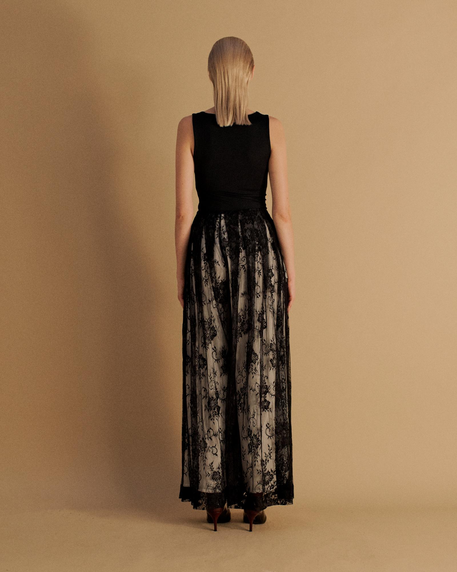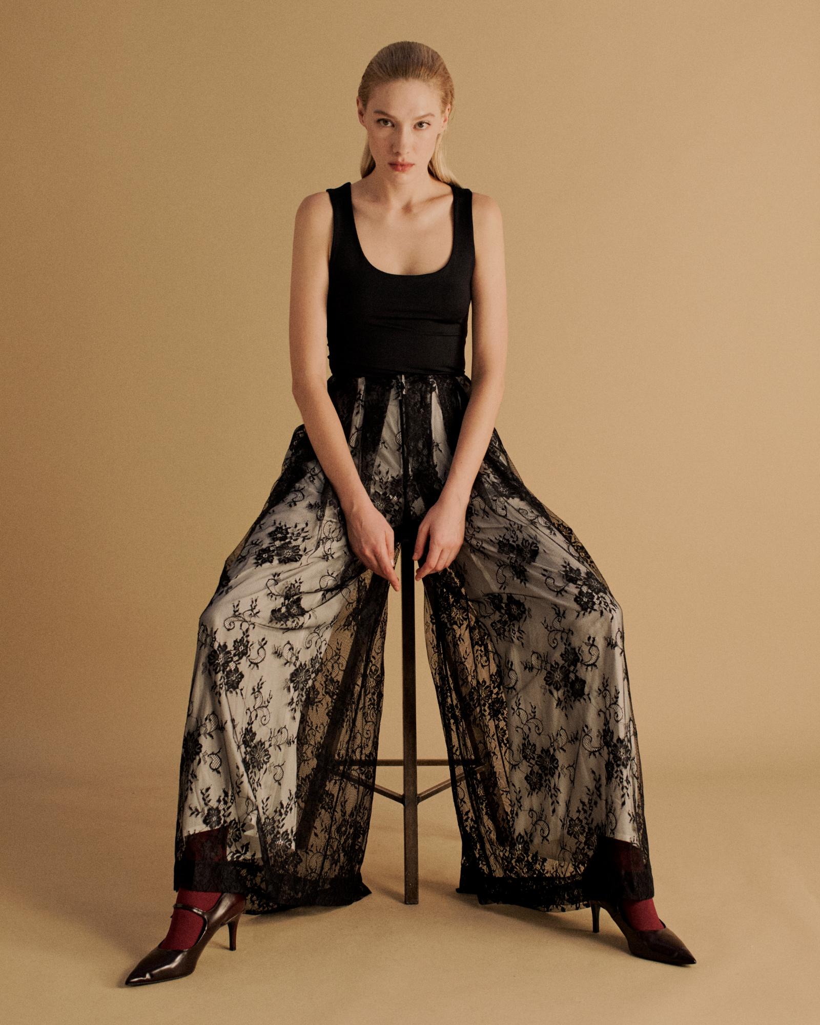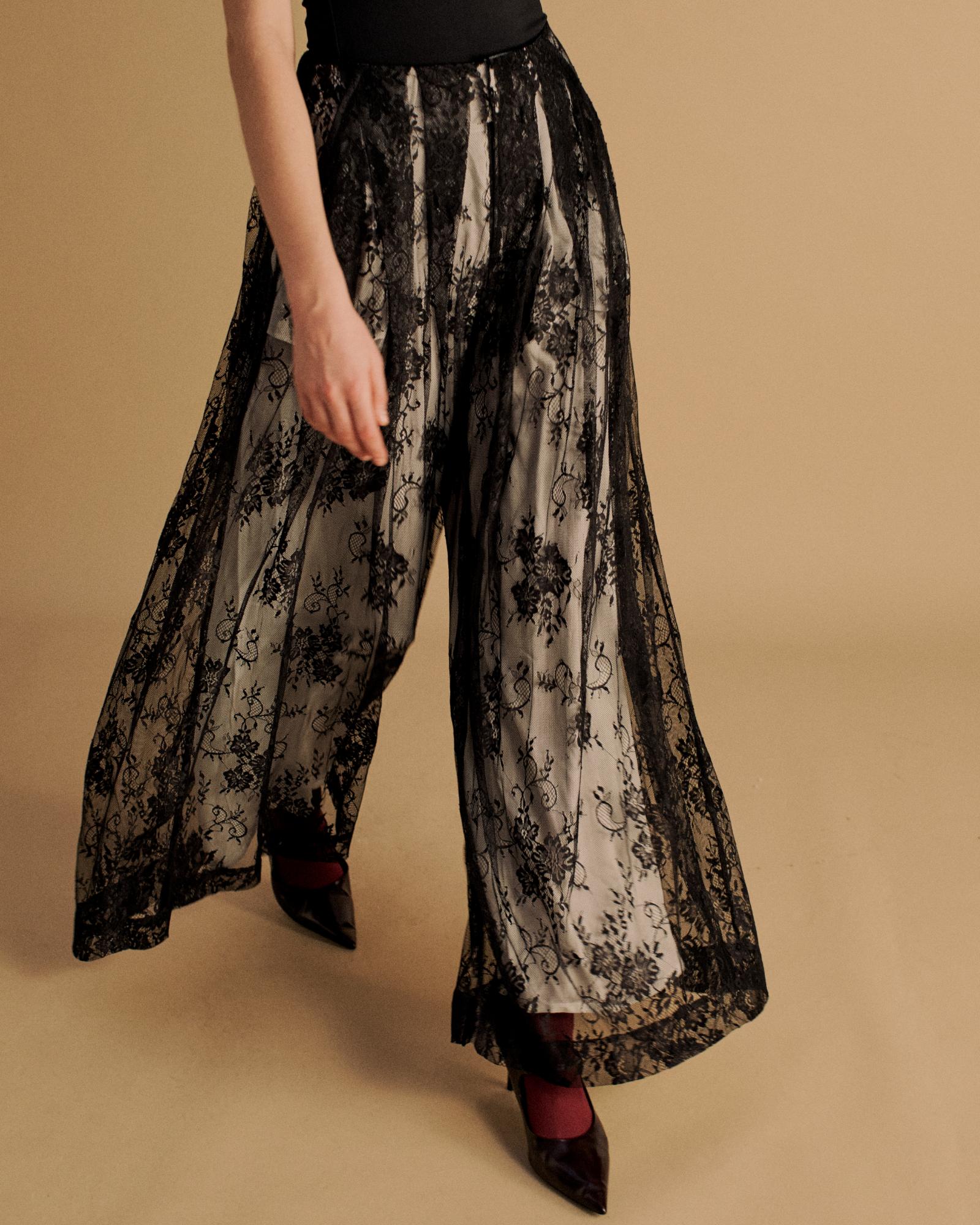 The Kloss Pleated Pants in Black Lace combine dramatic pleats with delicate lace detailing to create a striking, modern silhouette. These daring pants offer a bold yet refined look, perfect for making a confident statement at any event.