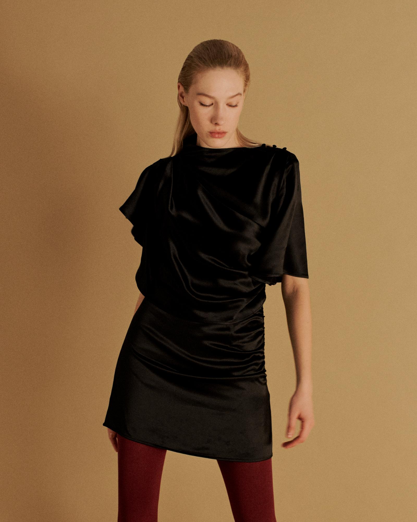 The Agnes Mini Dress in Dusk blends playful charm with edgy sophistication. Crafted from smooth satin, it features elegant draping and bold buttons along the shoulder for a striking finish. Its flirty mini length adds a daring touch, making it the perfect choice for confident evenings and standout moments.