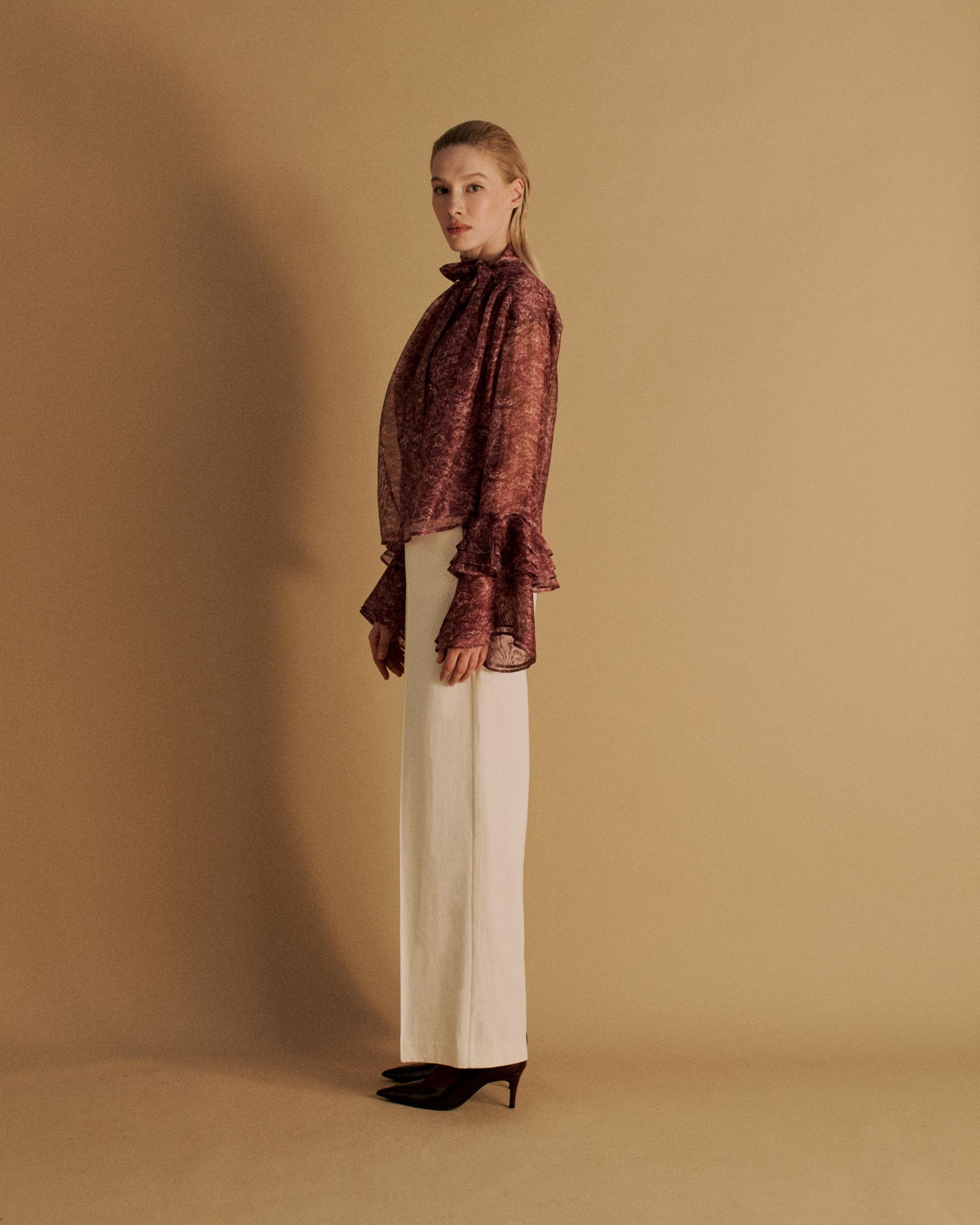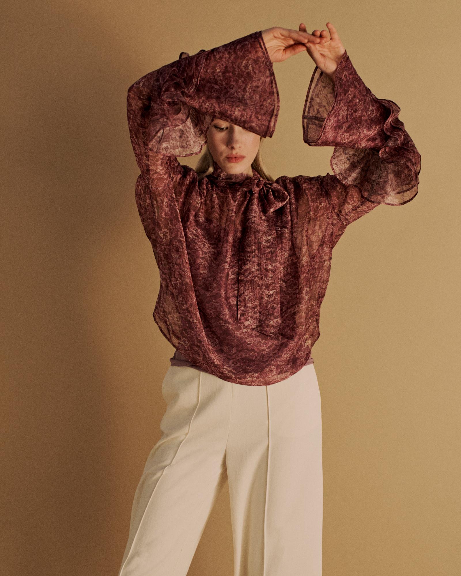 The Clara Blouse in Magenta Lace Print features a delicate lace design in a soft magenta shade that captivates with subtle intensity. Its double ruffle cuffs add a playful yet bold touch, while the bow at the neck elevates the look with confident flair. This blouse is perfect for those who dare to stand out with refined elegance.